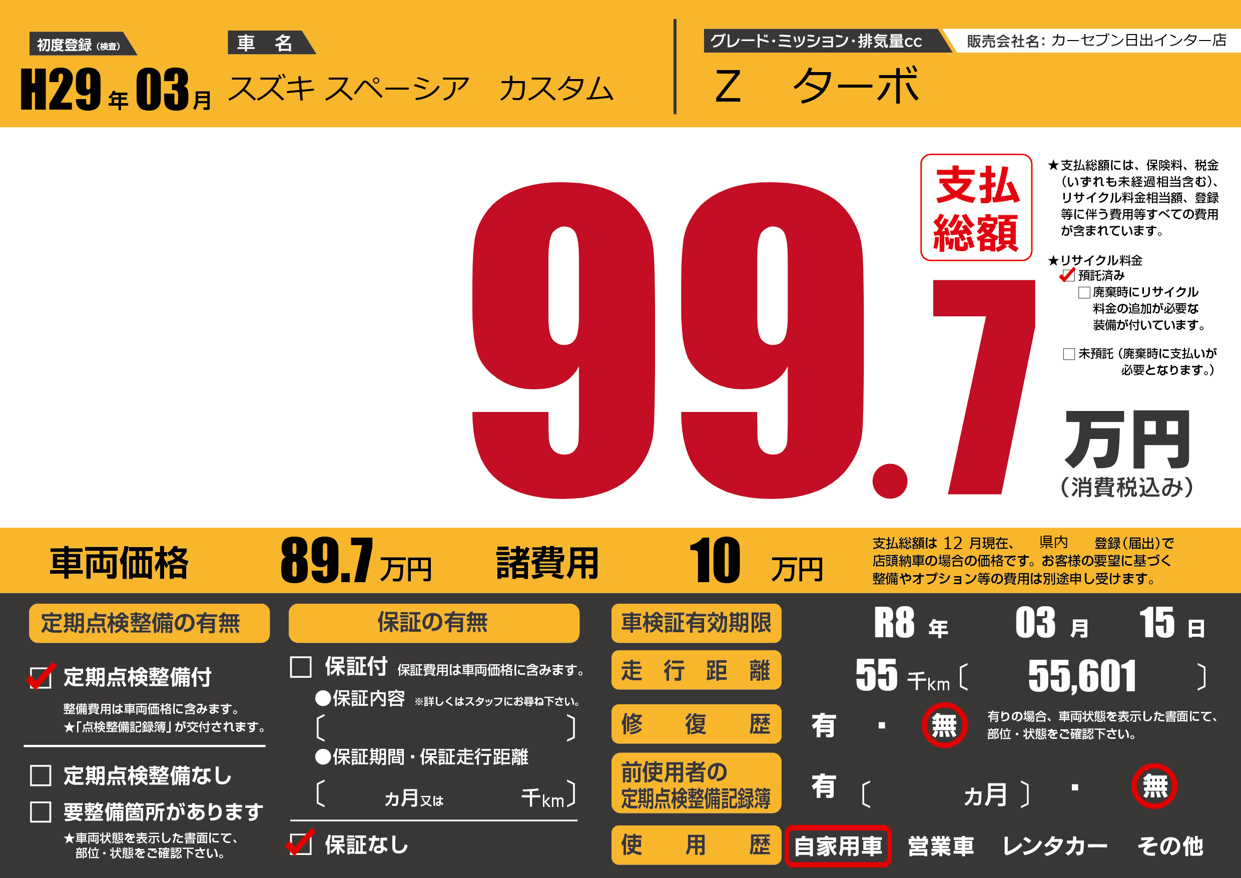 | 車名 | スズキ スペーシア カスタム | グレード ミッション 排気量 |