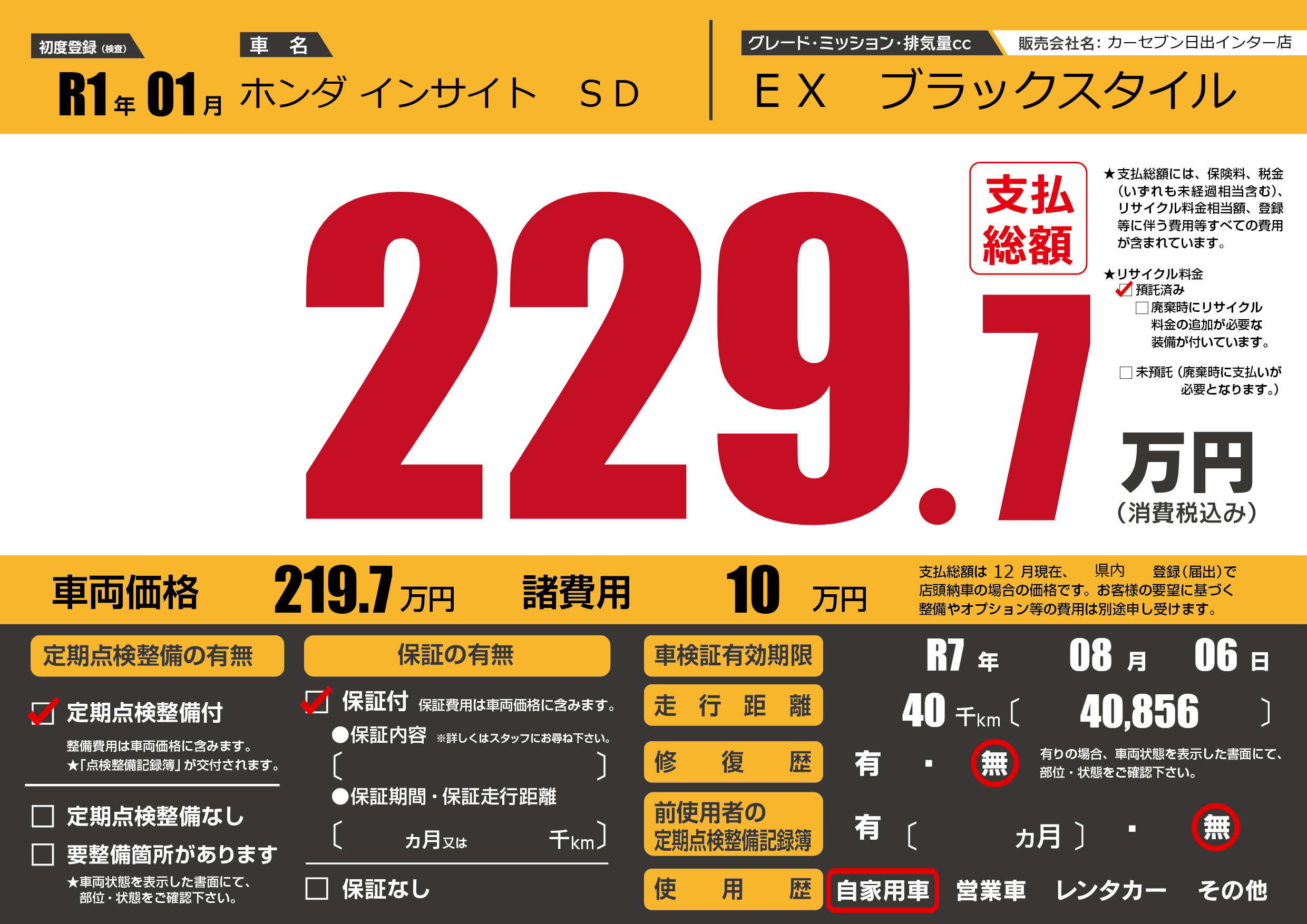 | 車名 | ホンダ インサイト SD | グレード ミッション 排気量 |