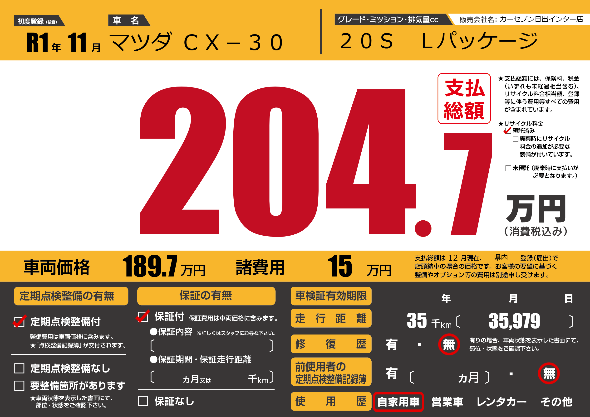 | 車名 | マツダ CX-30 | グレード ミッション 排気量 |