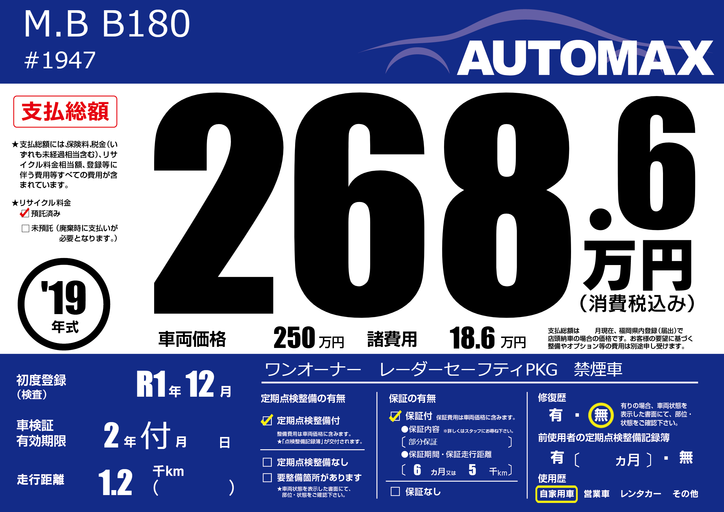 | 車名 | M.B B180 | グレード ミッション 排気量 |