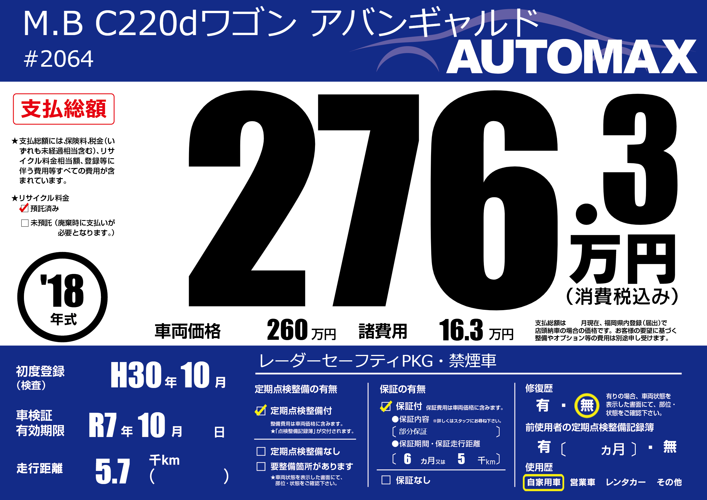 | 車名 | M.B C220dワゴン アバンギャルド | グレード ミッション 排気量 |