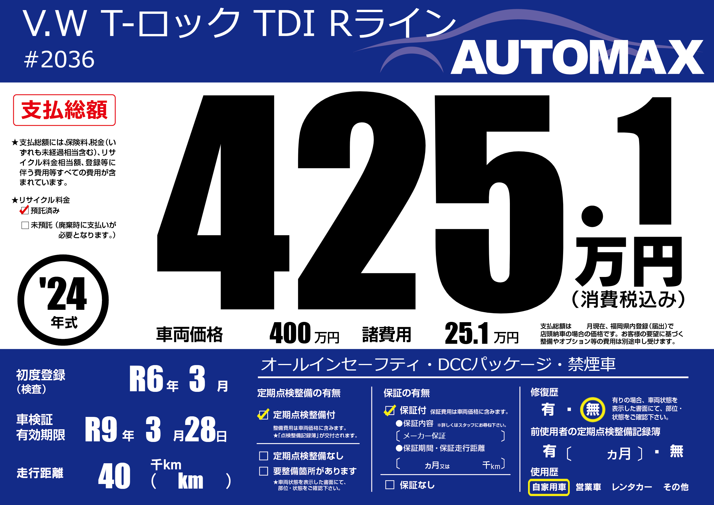 | 車名 | V.W T-ロック TDI Rライン | グレード ミッション 排気量 |