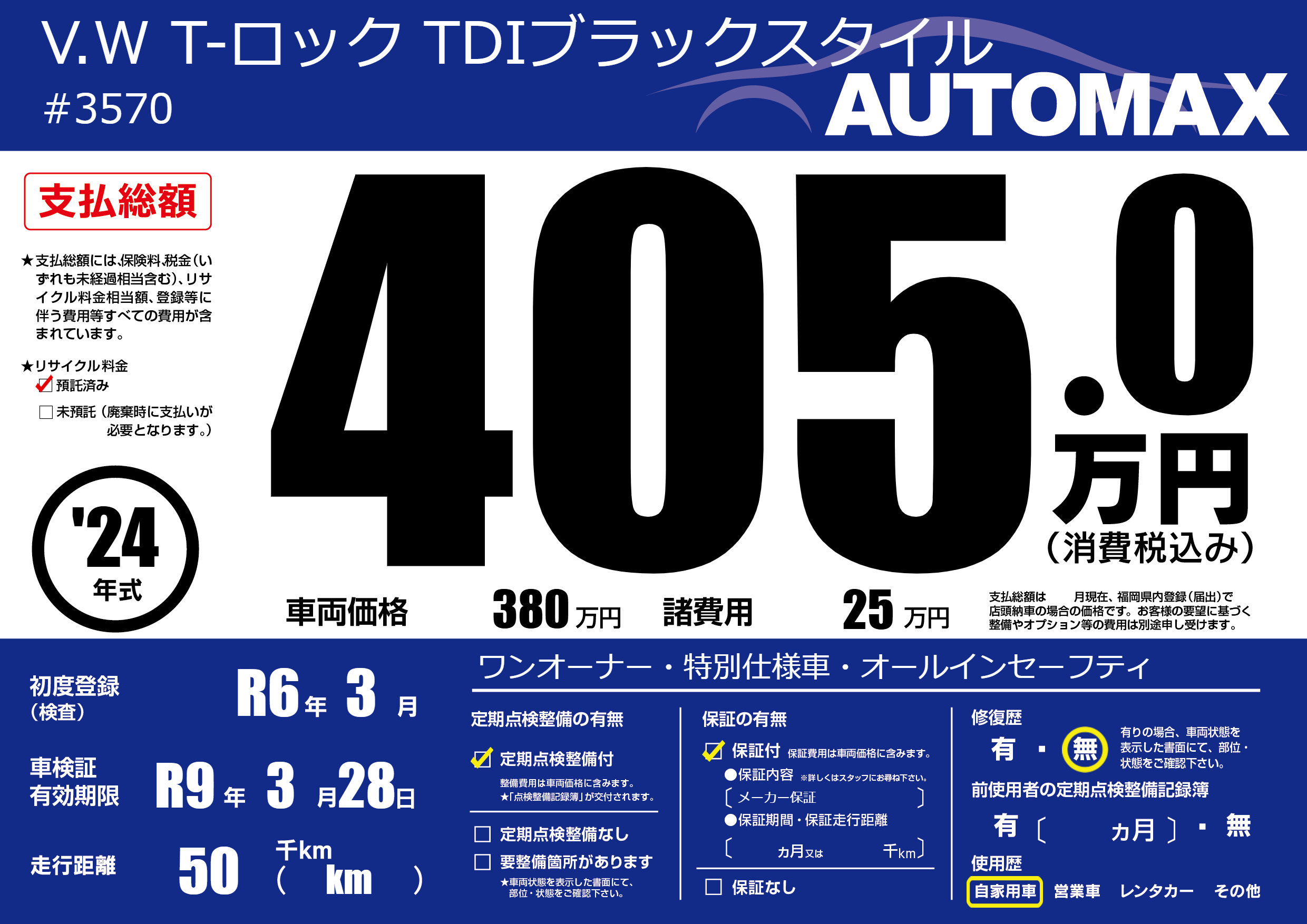 | 車名 | V.W T-ロック TDIブラックスタイル | グレード ミッション 排気量 |