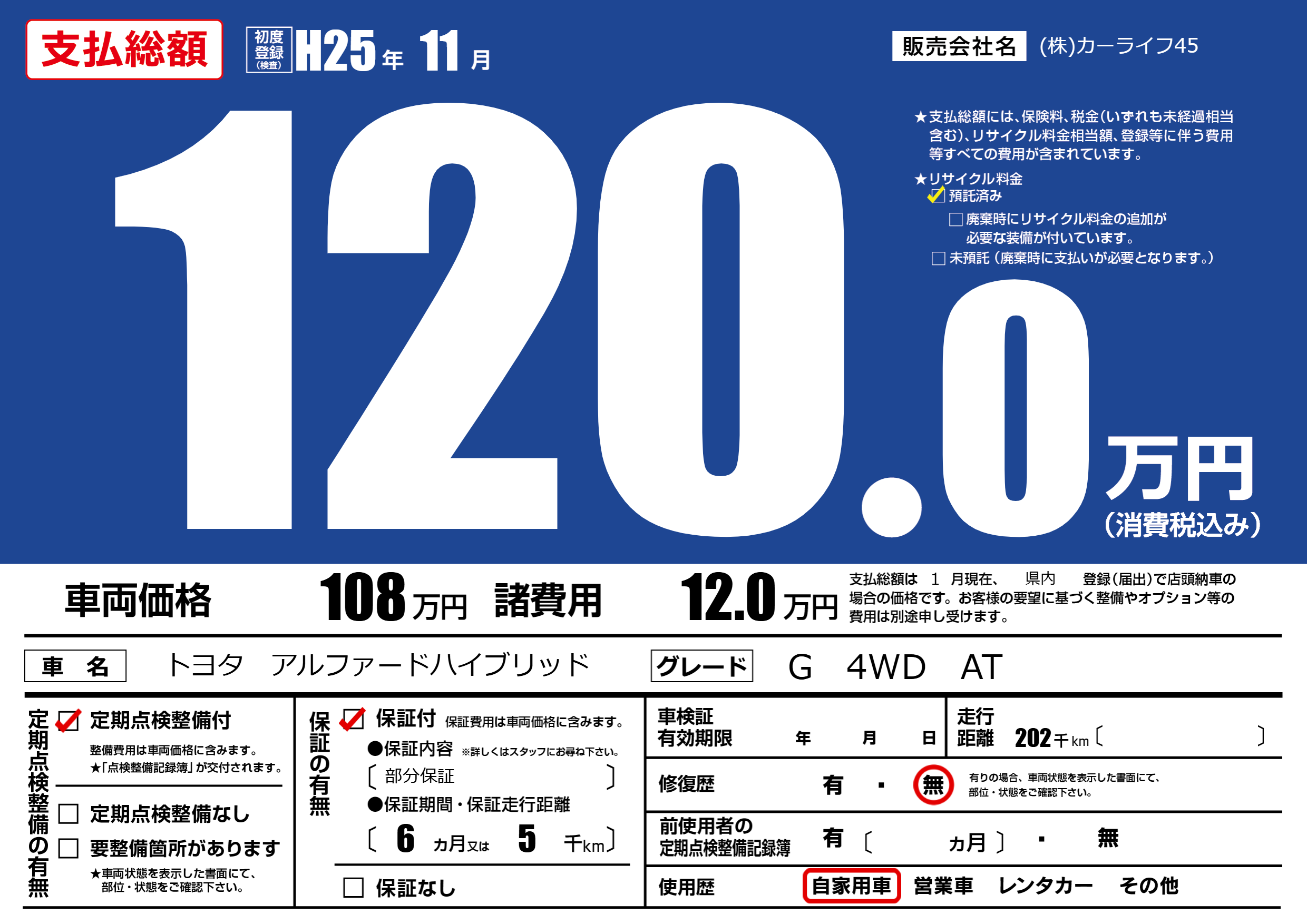 | 車名 | トヨタ アルファードハイブリッド | グレード ミッション 排気量 |