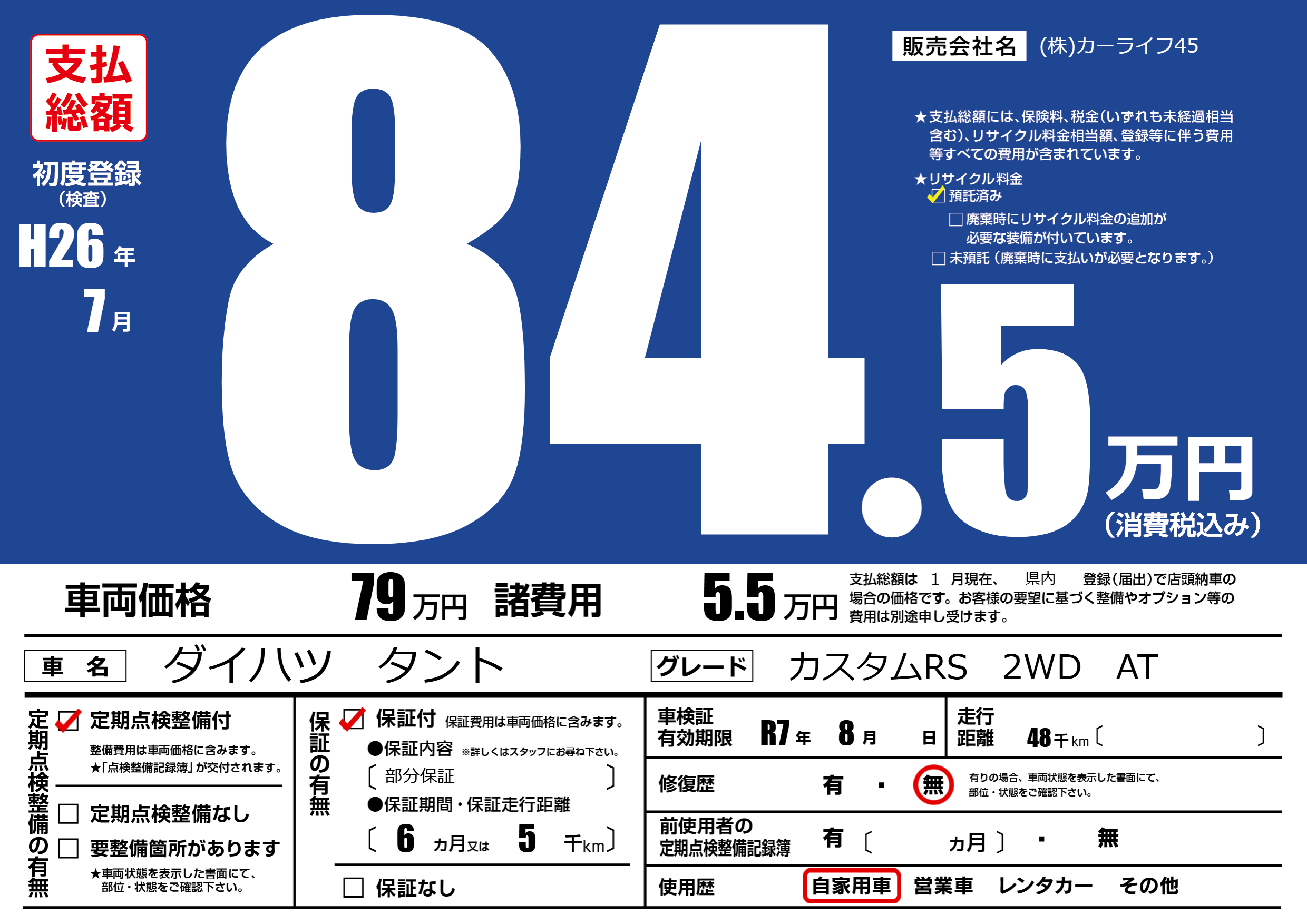 | 走行キロ | 4.8万km | 初年度登録 | H26年7月 |