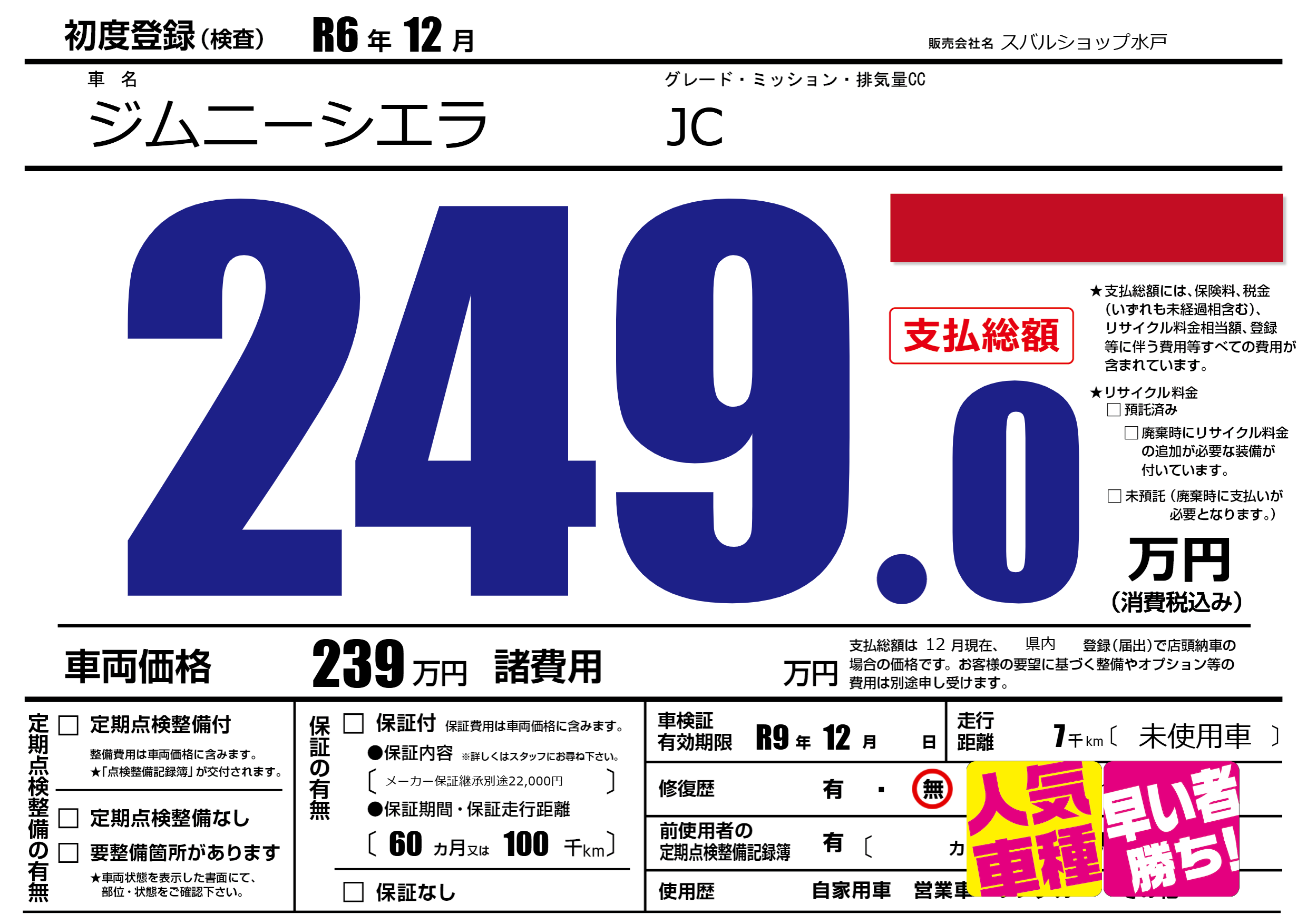 | 車名 | ジムニーシエラ | グレード ミッション 排気量 |