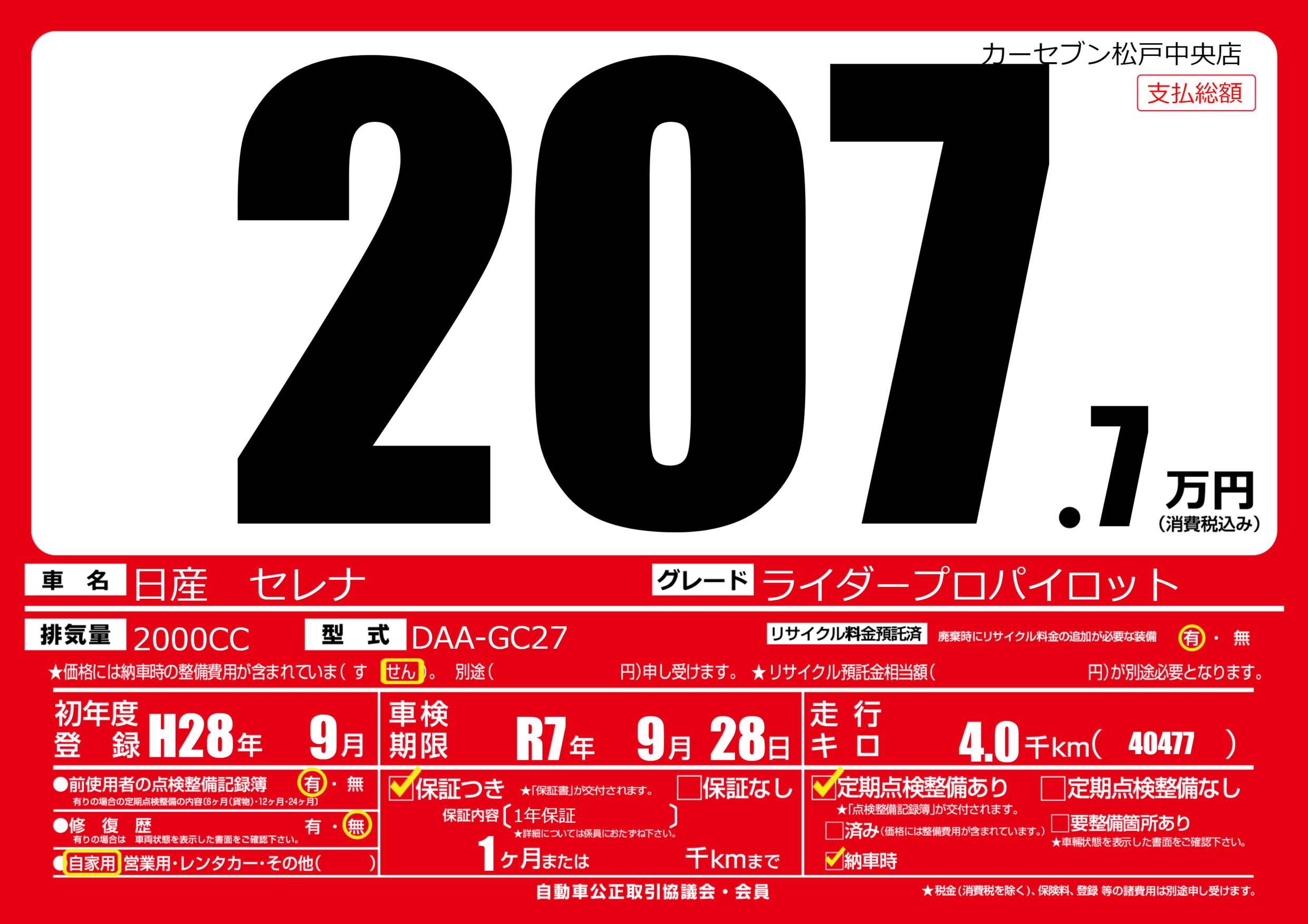| 車名 | 日産 セレナ | グレード ミッション 排気量 |