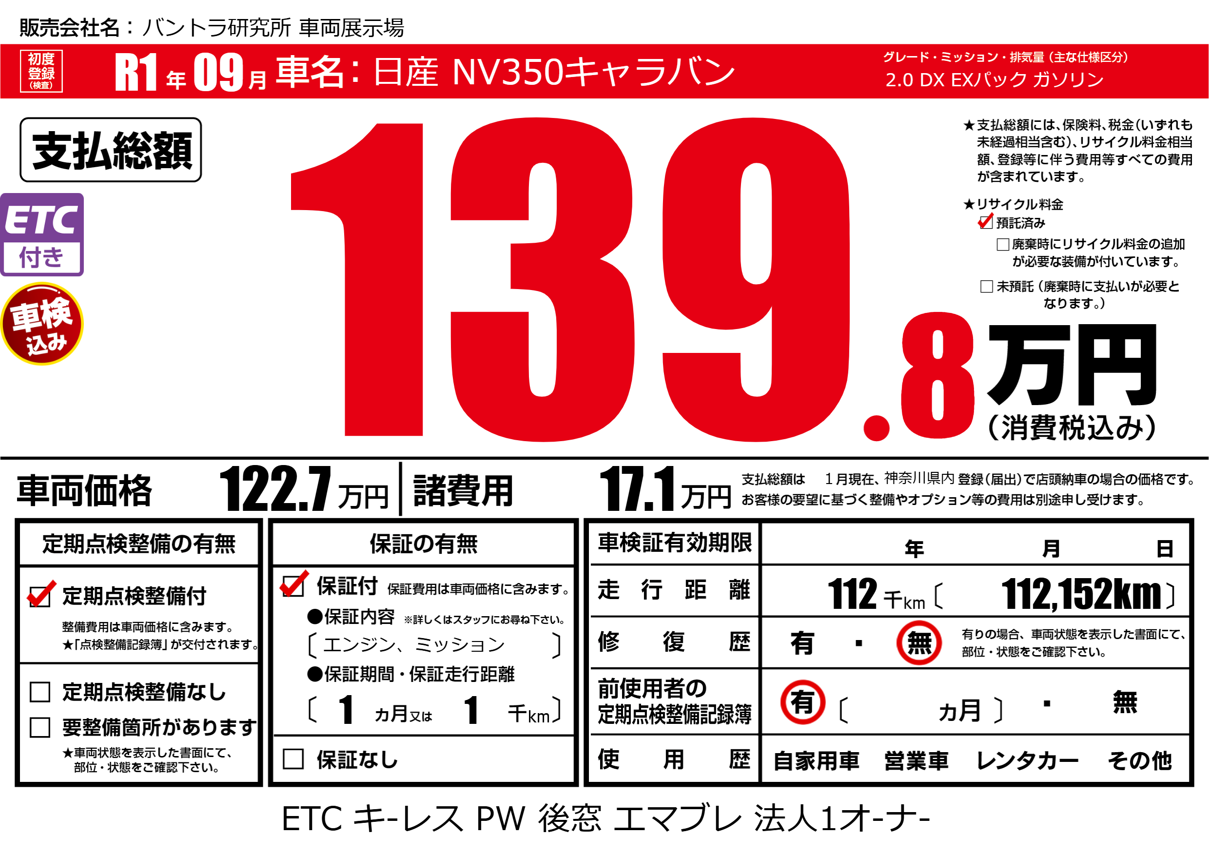 | 車名 | 日産 NV350キャラバン | グレード ミッション 排気量 |
