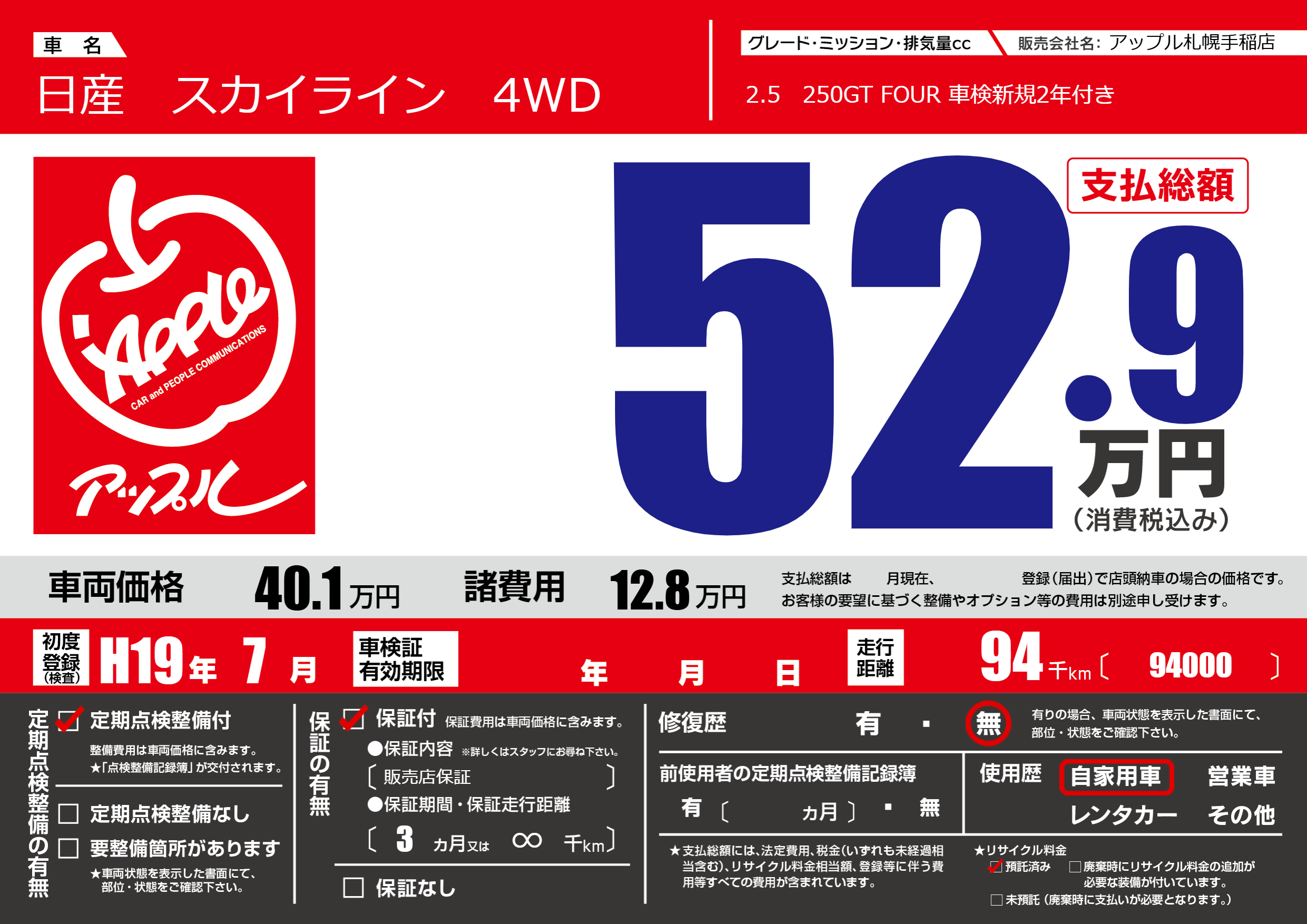| 車名 | 日産 スカイライン 4WD | グレード ミッション 排気量 |