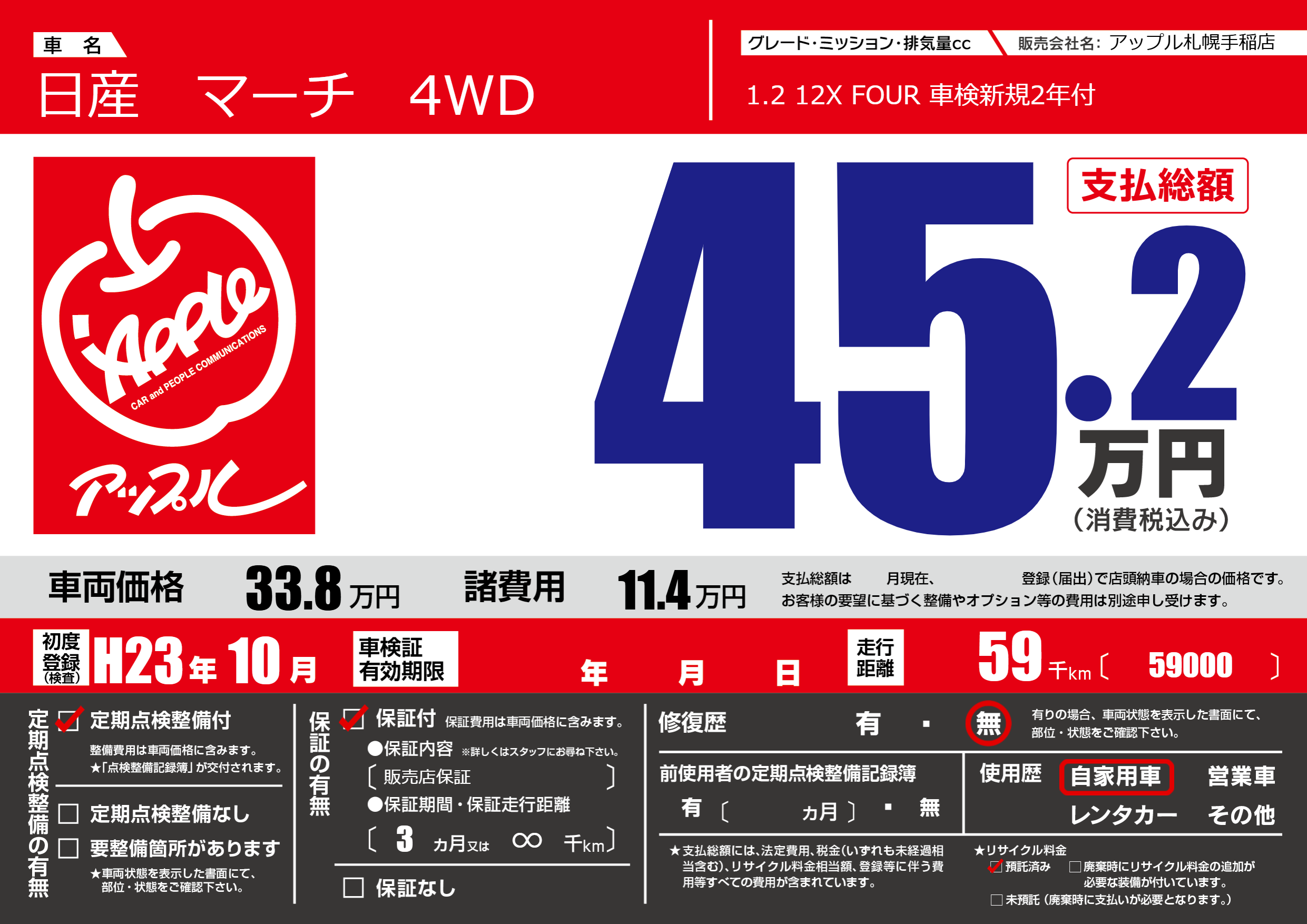| 車名 | 日産 マーチ 4WD | グレード ミッション 排気量 |