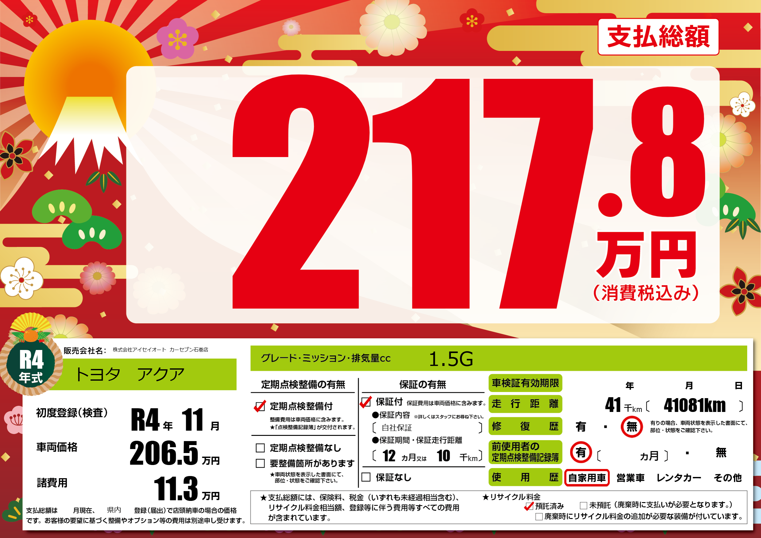 | 車名 | トヨタ アクア | グレード ミッション 排気量 |