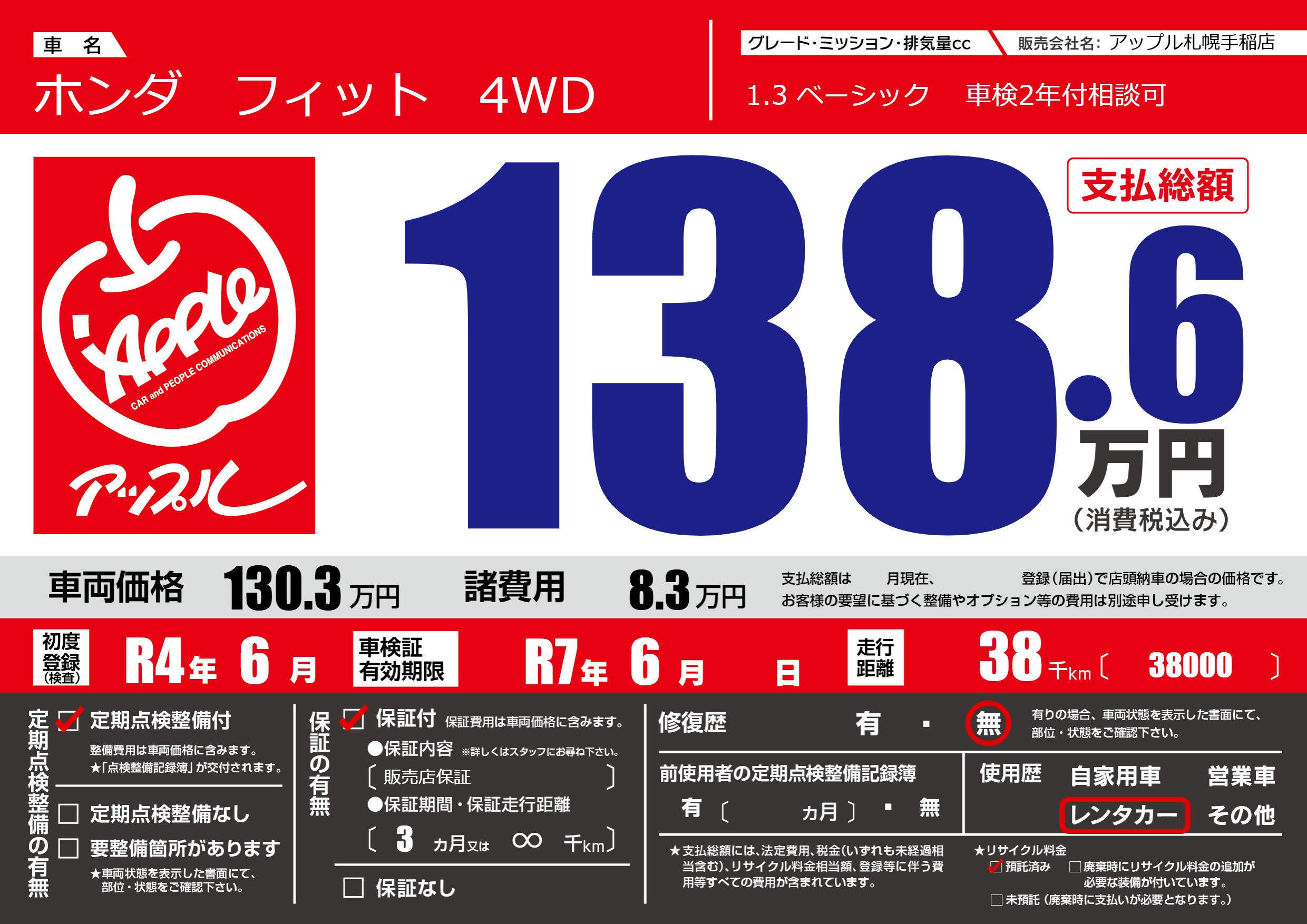 | 走行キロ | 3.8万km | 初年度登録 | R4年6月 |