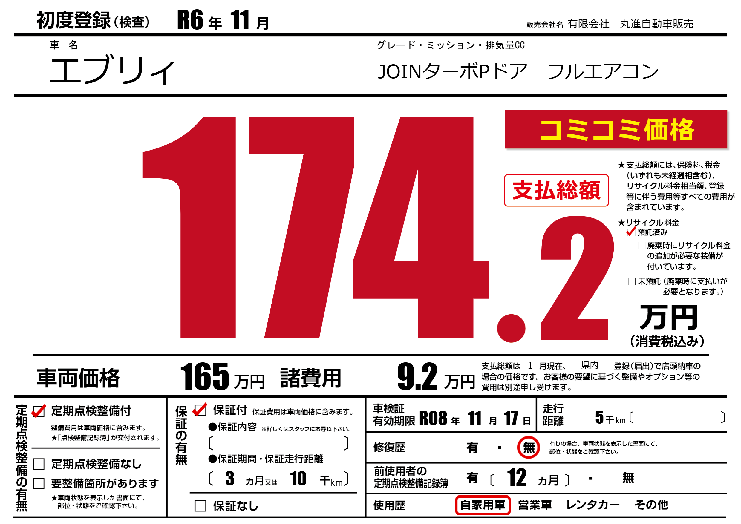 | 走行キロ | 0.5万km | 初年度登録 | R6年11月 |