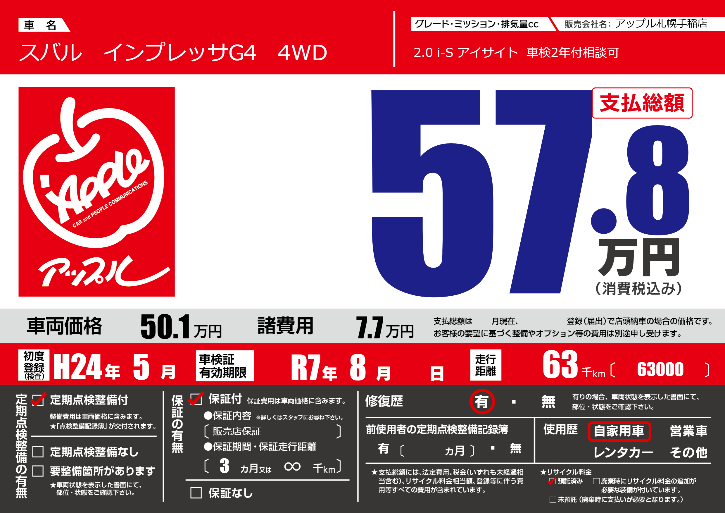 | 車名 | スバル インプレッサG4 4WD | グレード ミッション 排気量 |