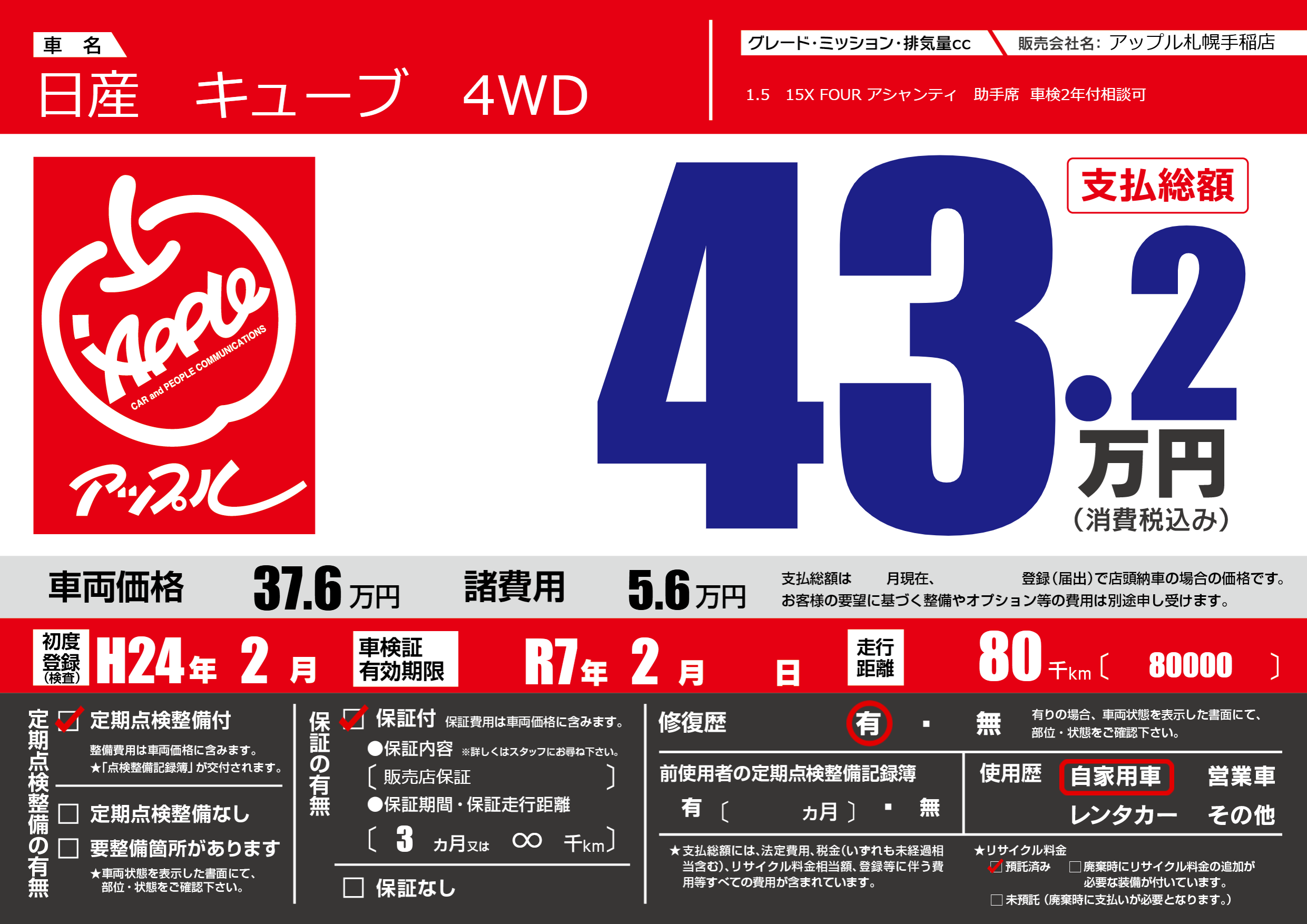 | 車名 | 日産 キューブ 4WD | グレード ミッション 排気量 |