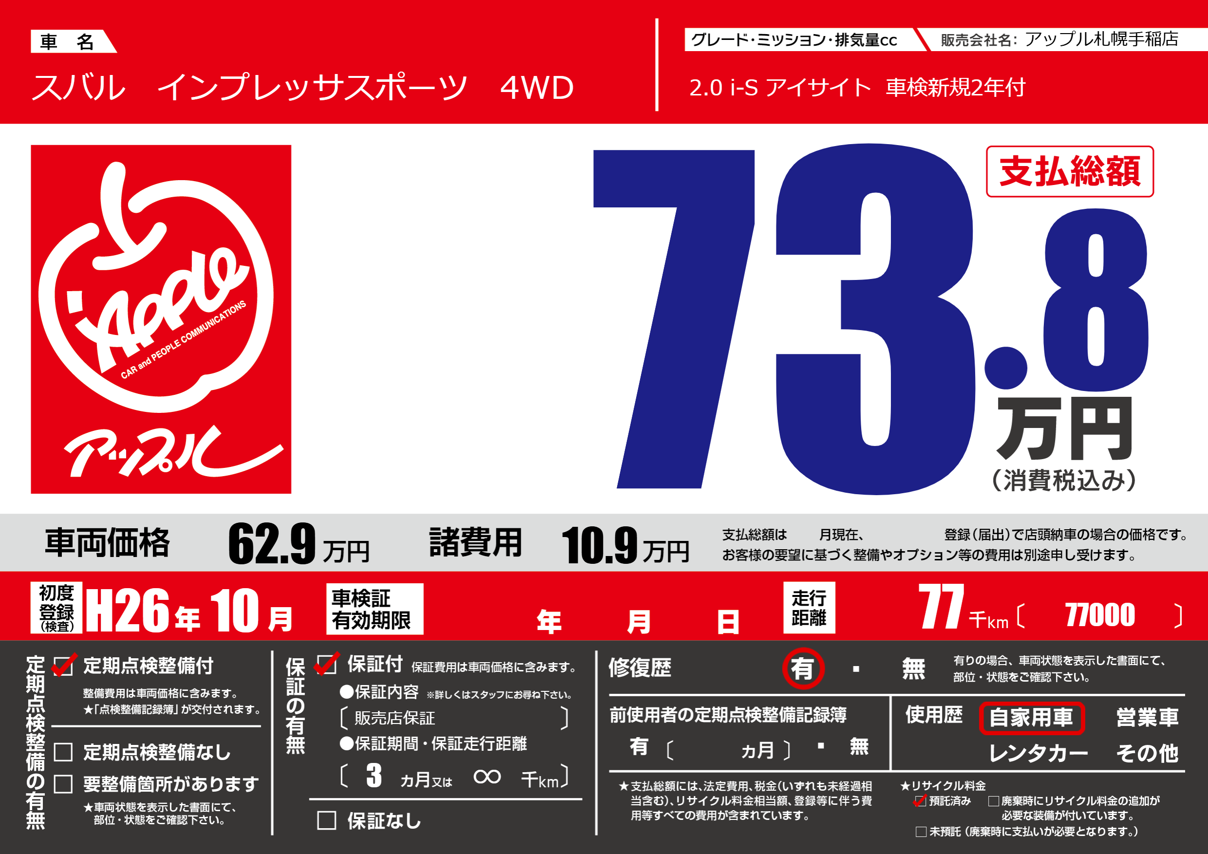 | 車名 | スバル インプレッサスポーツ 4WD | グレード ミッション 排気量 |