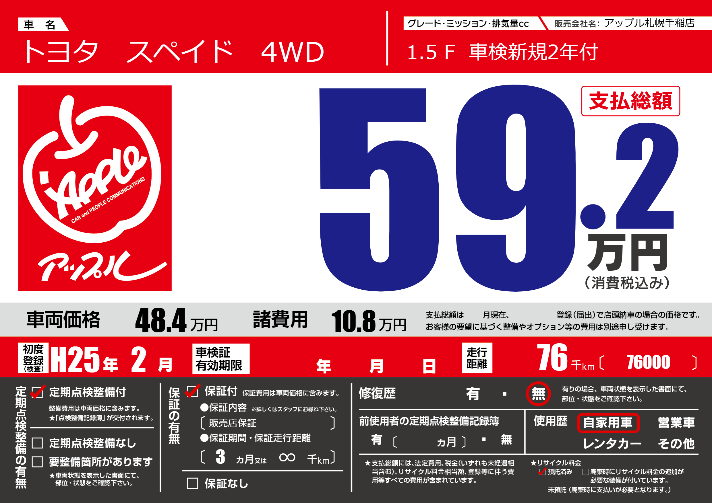 | 車名 | トヨタ スペイド 4WD | グレード ミッション 排気量 |