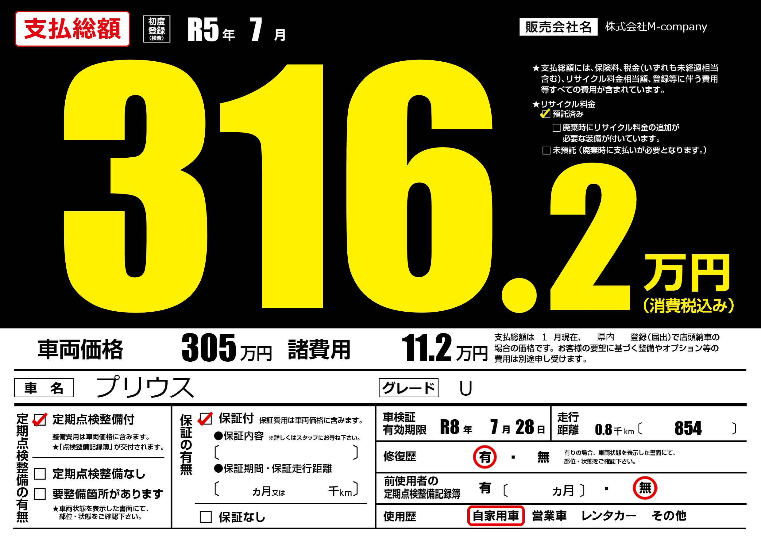 | 車名 | プリウス | グレード ミッション 排気量 |