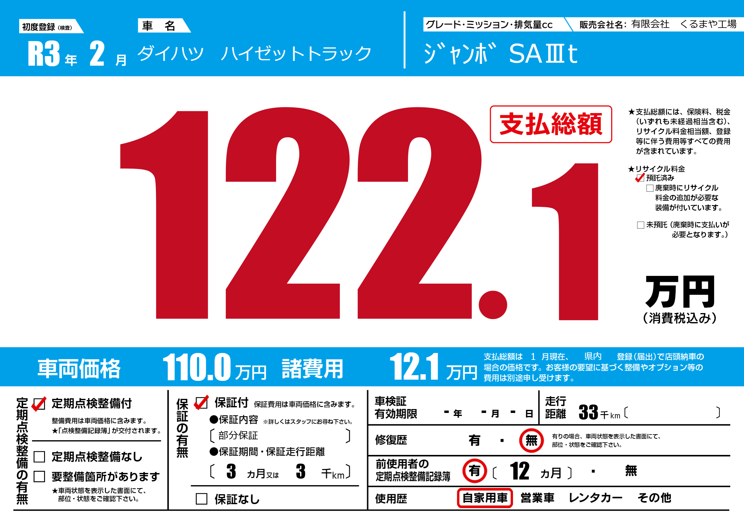 | 走行キロ | 3.3万km | 初年度登録 | R3年2月 |