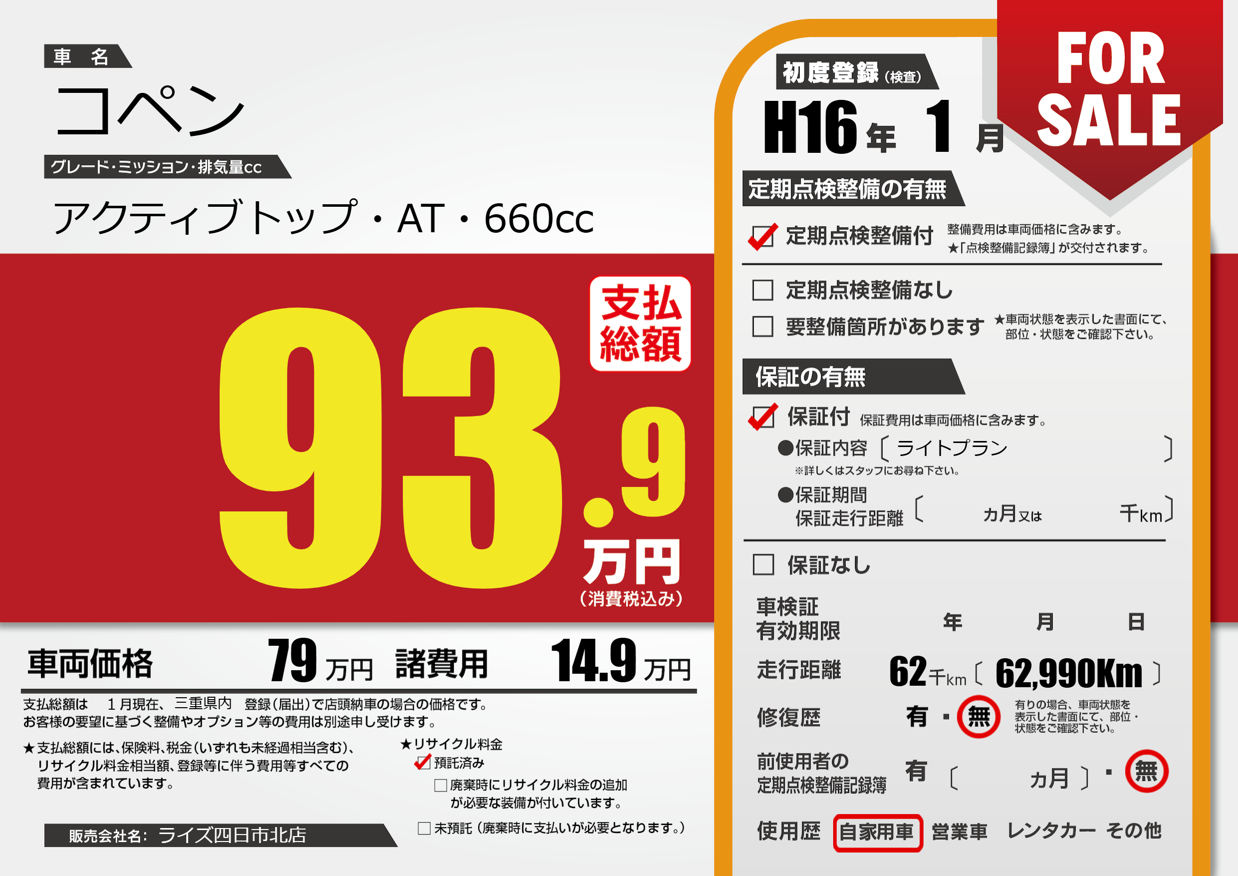 | 走行キロ | 6.2万km | 初年度登録 | H16年1月 |