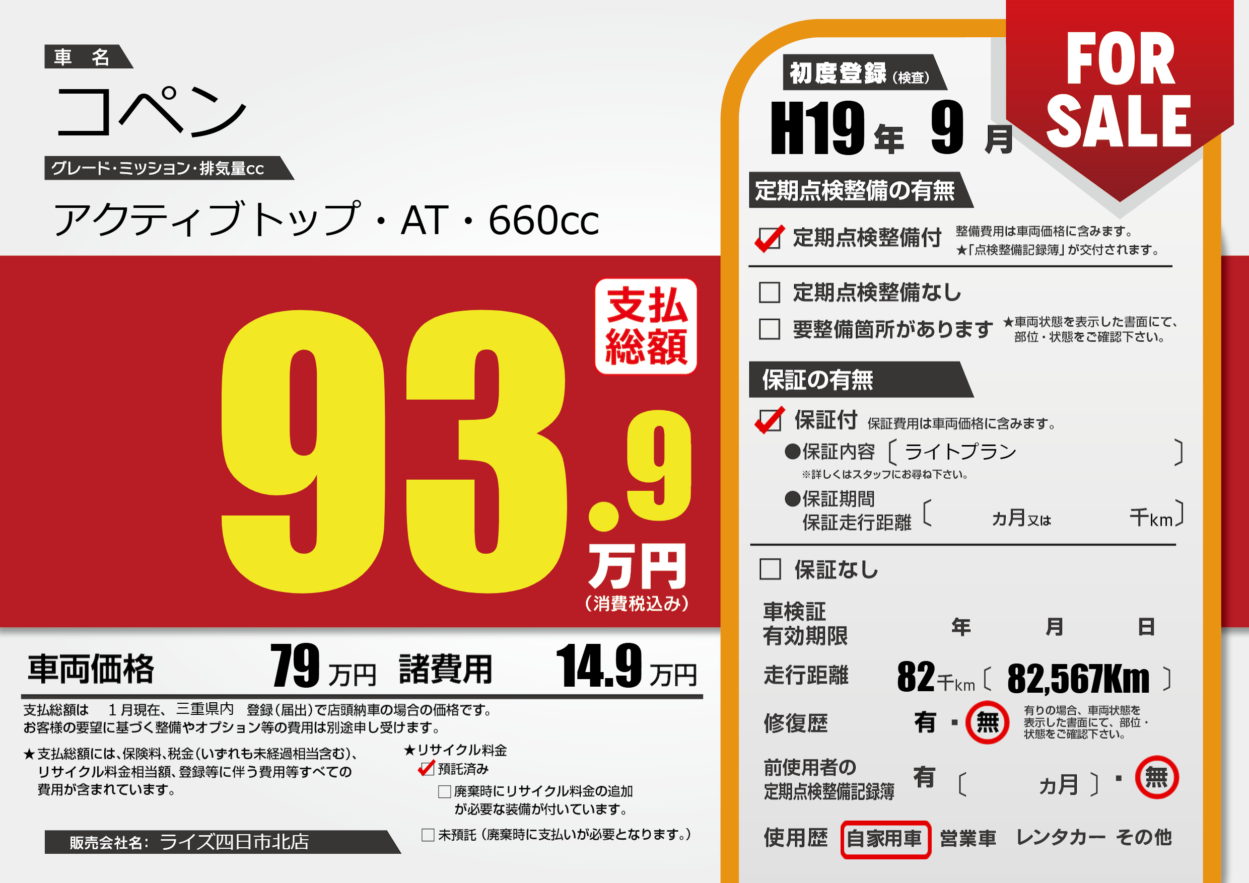 | 走行キロ | 8.2万km | 初年度登録 | H19年9月 |