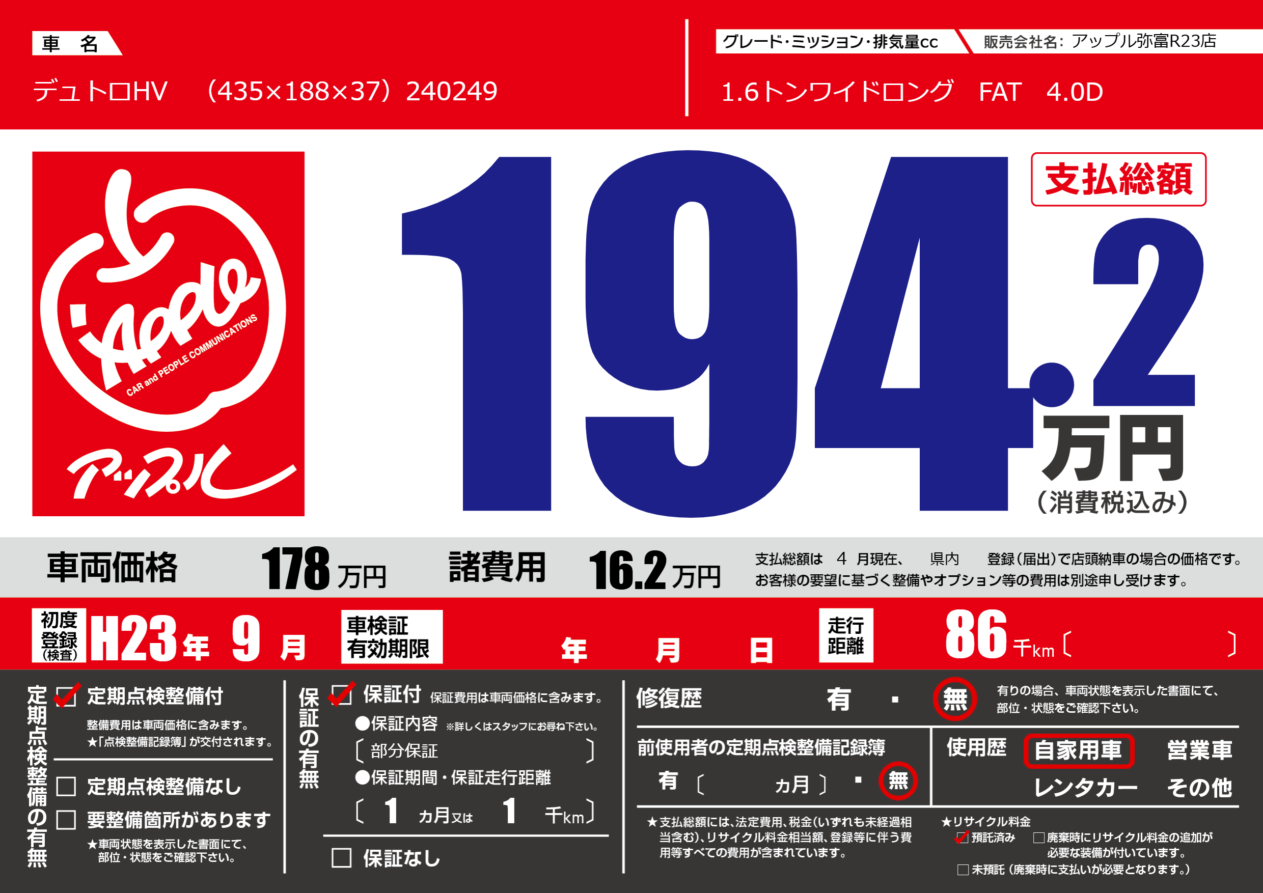 | 車名 | デュトロHV (435×188×37)240249 | グレード ミッション 排気量 |