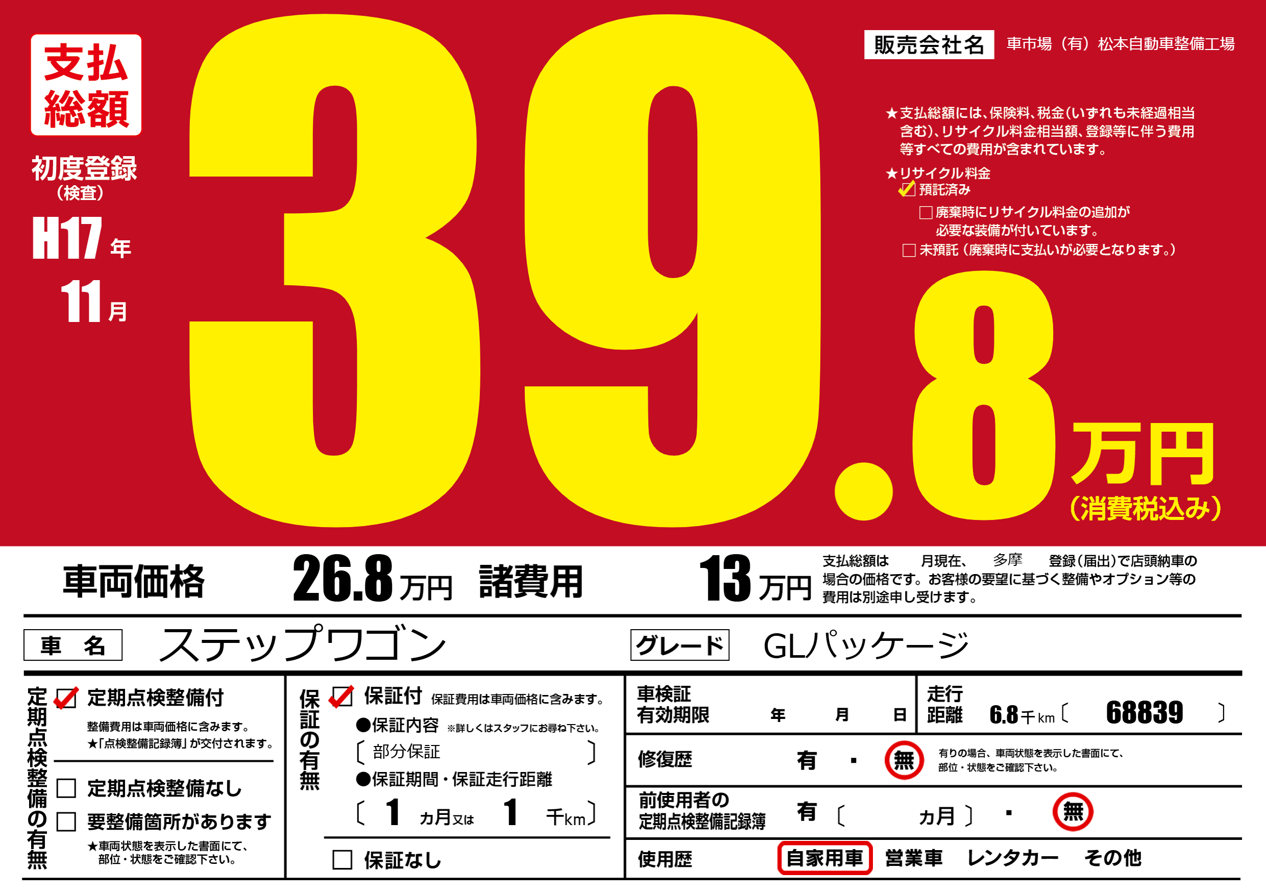 | 走行キロ | 0.6万km | 初年度登録 | H17年11月 |