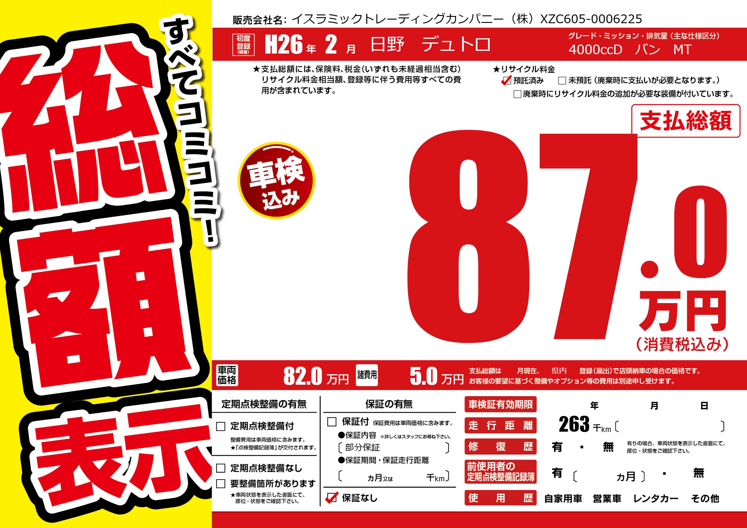 | 走行キロ | 26.3万km | 初年度登録 | H26年2月 |