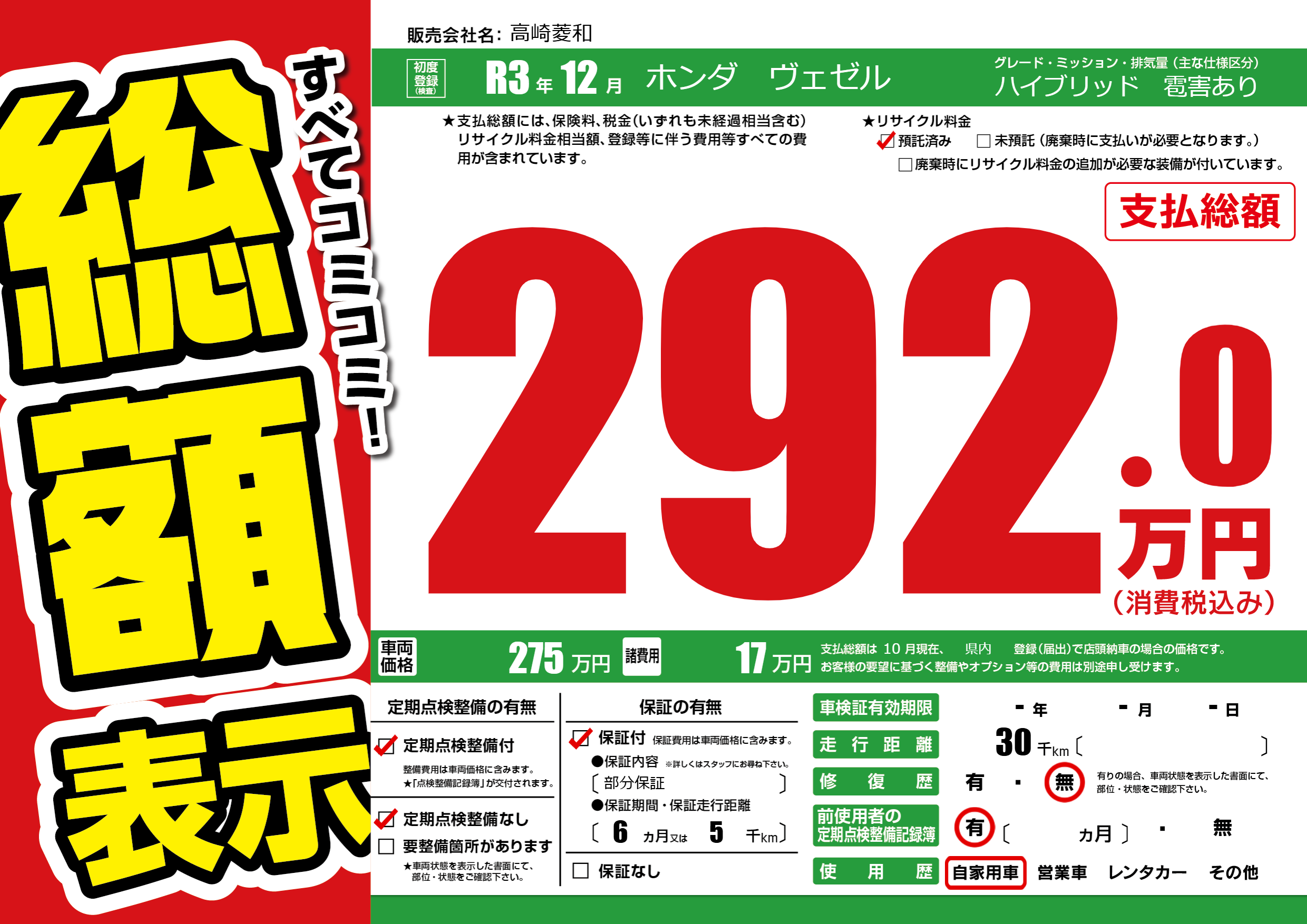 | 車名 | ホンダ ヴェゼル | グレード ミッション 排気量 |