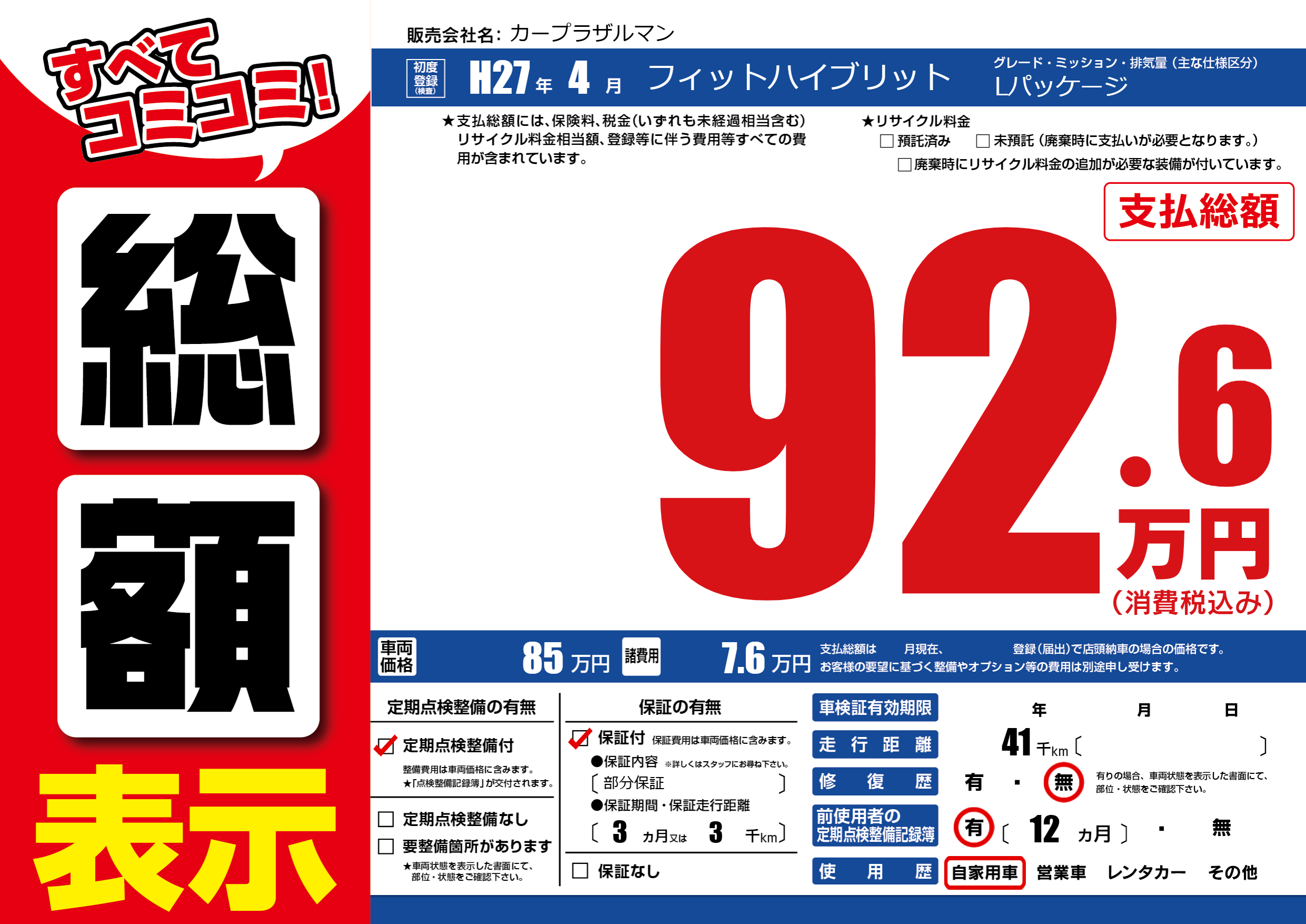 | 車名 | フィットハイブリット | グレード ミッション 排気量 |