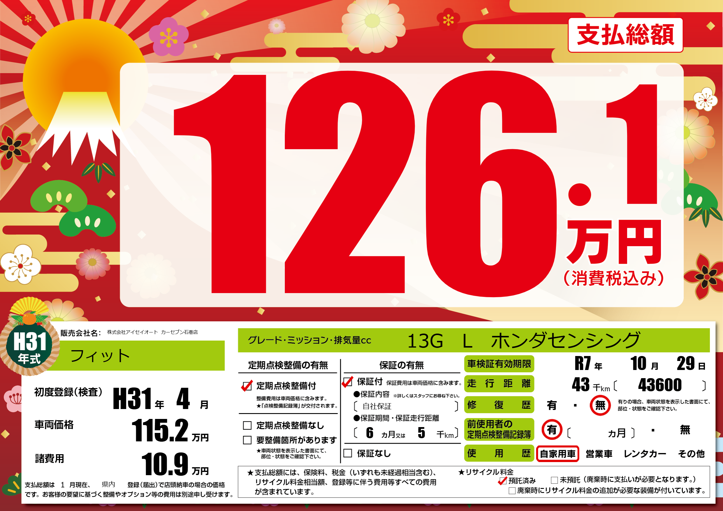 | 走行キロ | 4.3万km | 初年度登録 | H31年4月 |