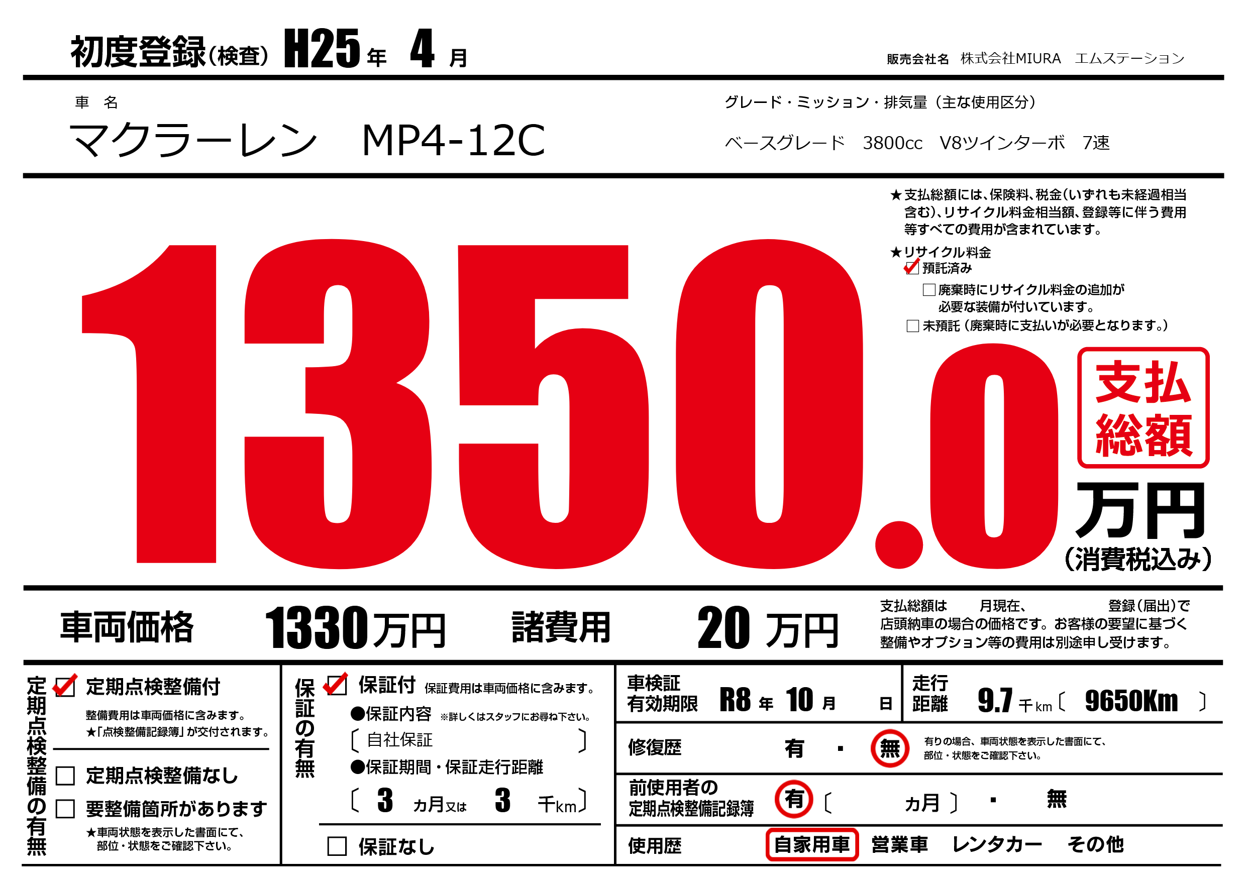 | 車名 | マクラーレン MP4-12C | グレード ミッション 排気量 |
