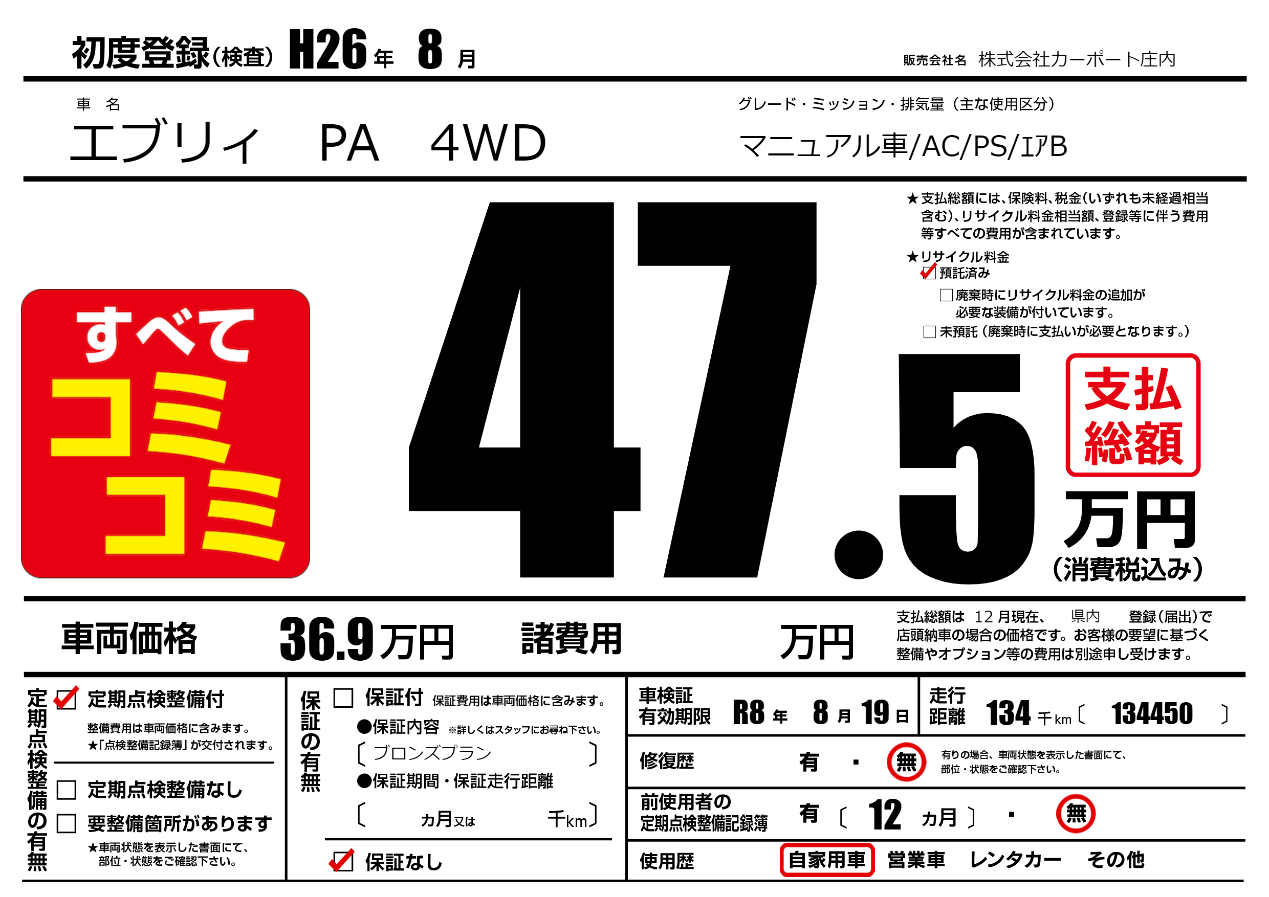 | 車名 | エブリィ PA 4WD | グレード ミッション 排気量 |