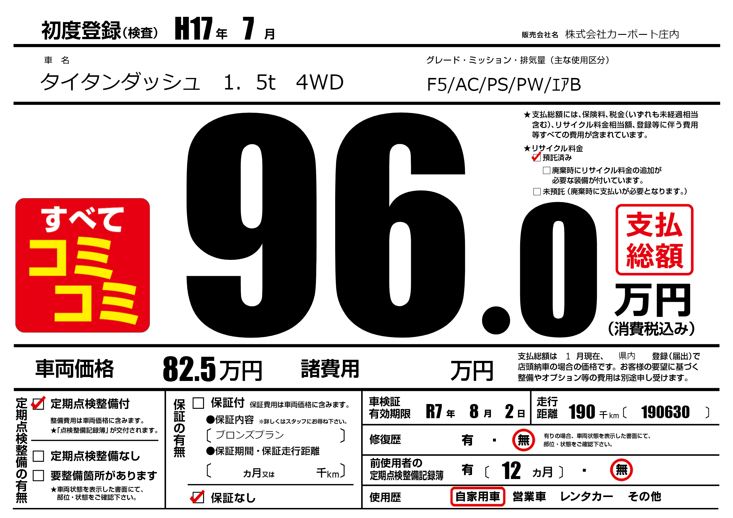 | 車名 | タイタンダッシュ 1.5t 4WD | グレード ミッション 排気量 |