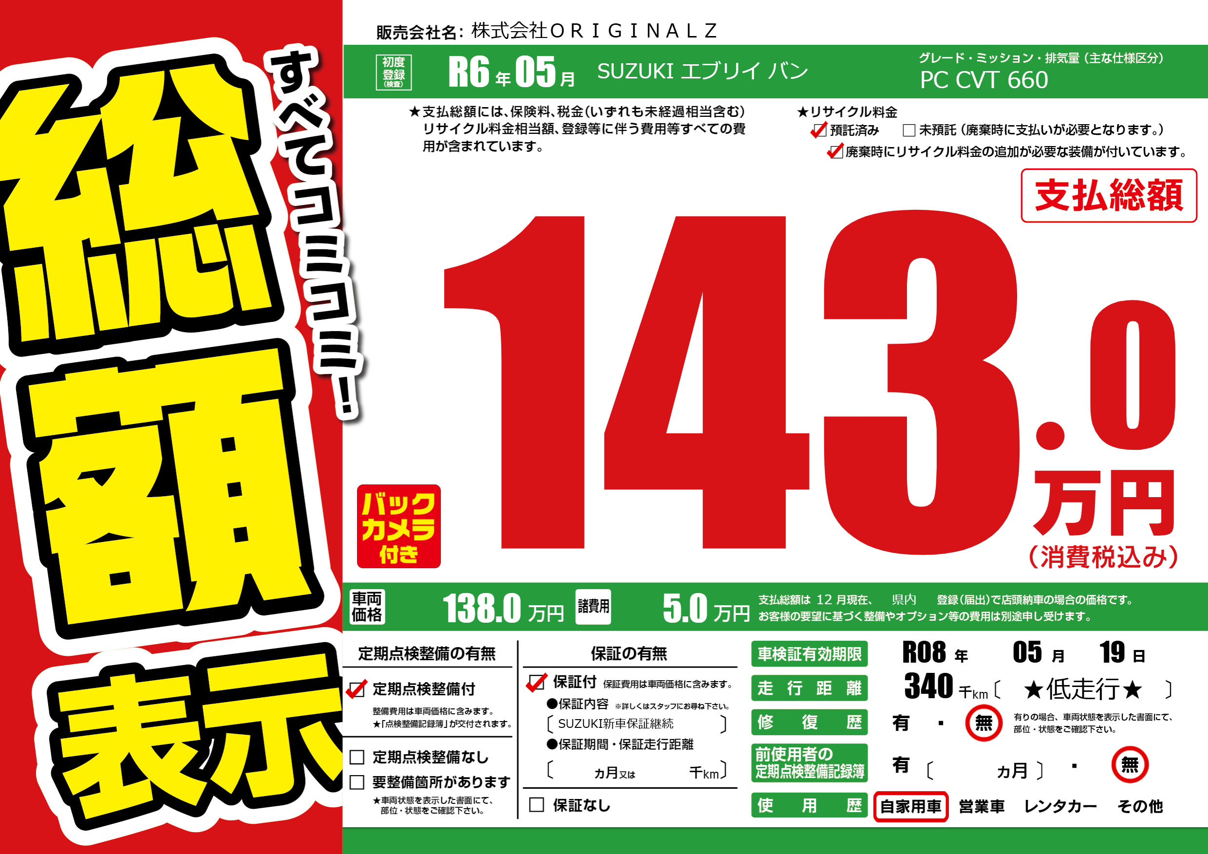 | 車名 | SUZUKI エブリイ バン | グレード ミッション 排気量 |
