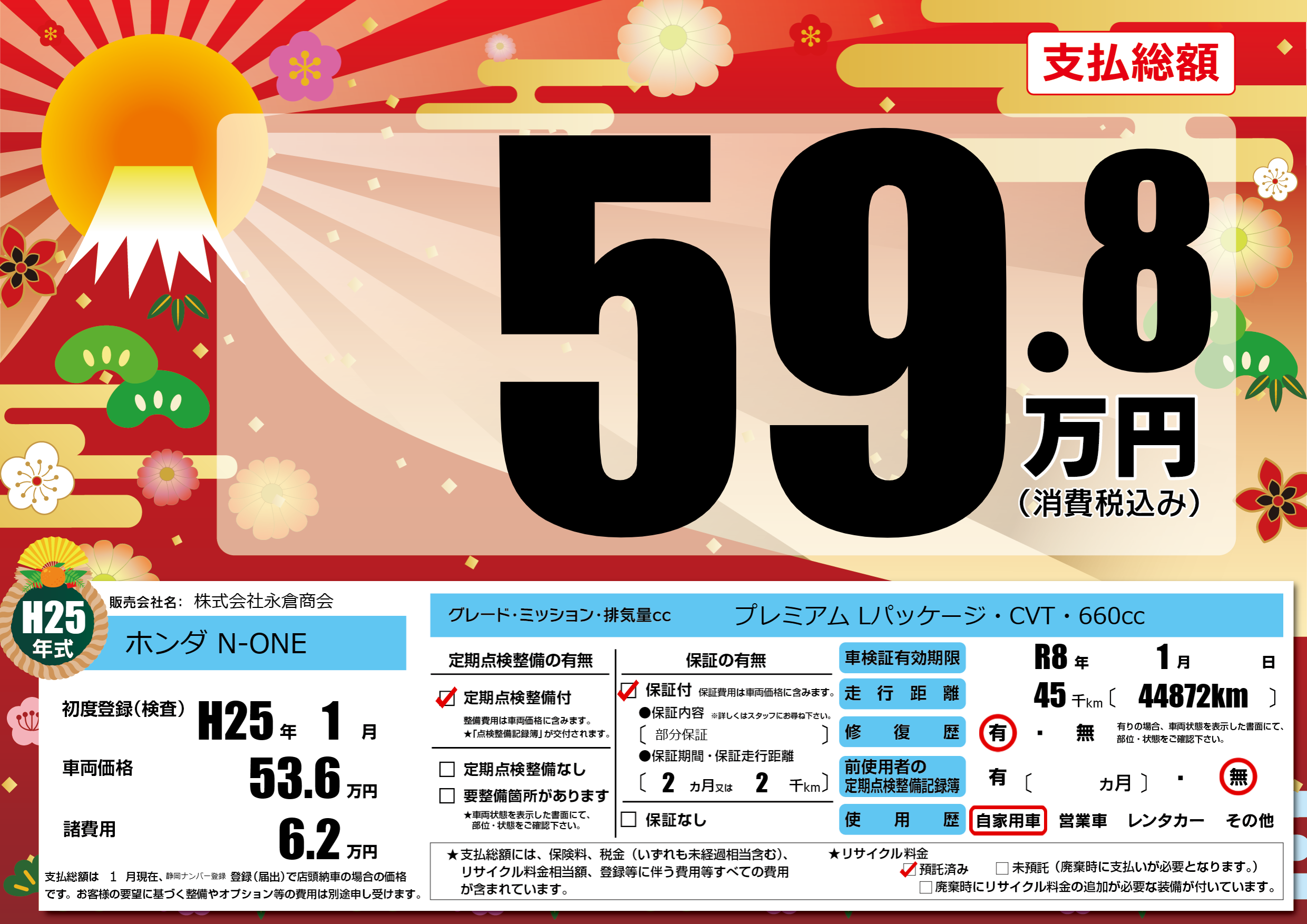 | 車名 | ホンダ N-ONE | グレード ミッション 排気量 |