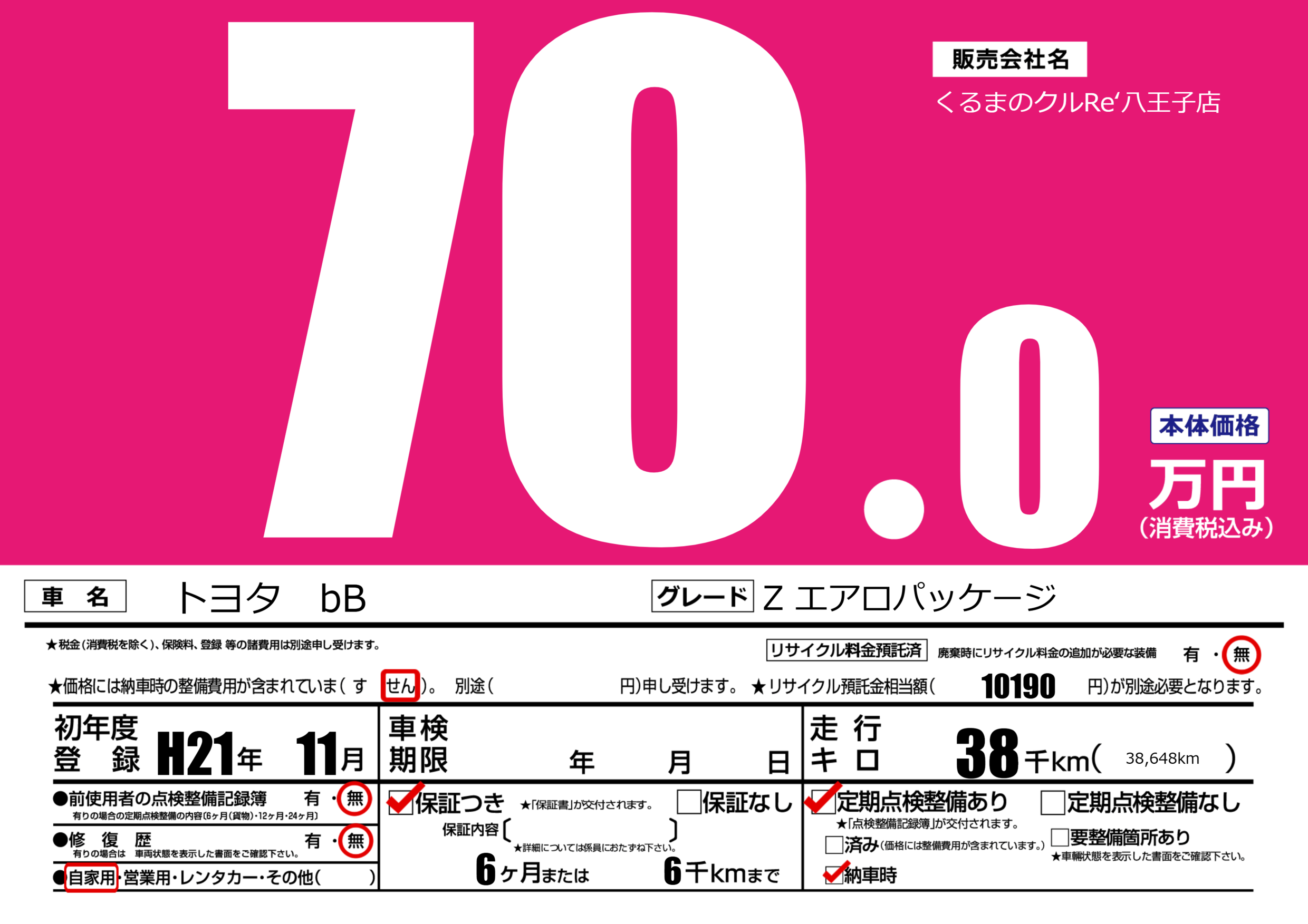 | 車名 | トヨタ bB | グレード ミッション 排気量 |