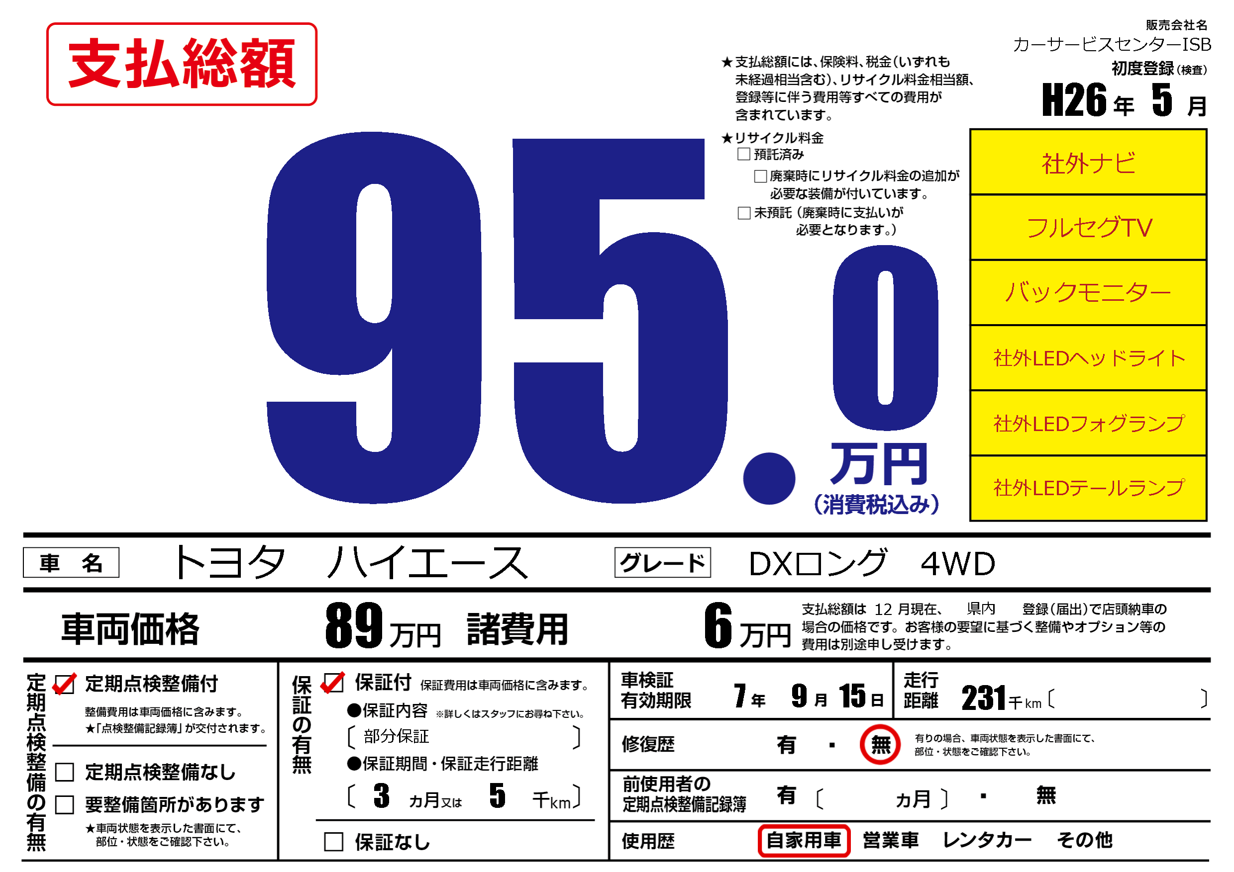 | 走行キロ | 23.1万km | 初年度登録 | H26年5月 |