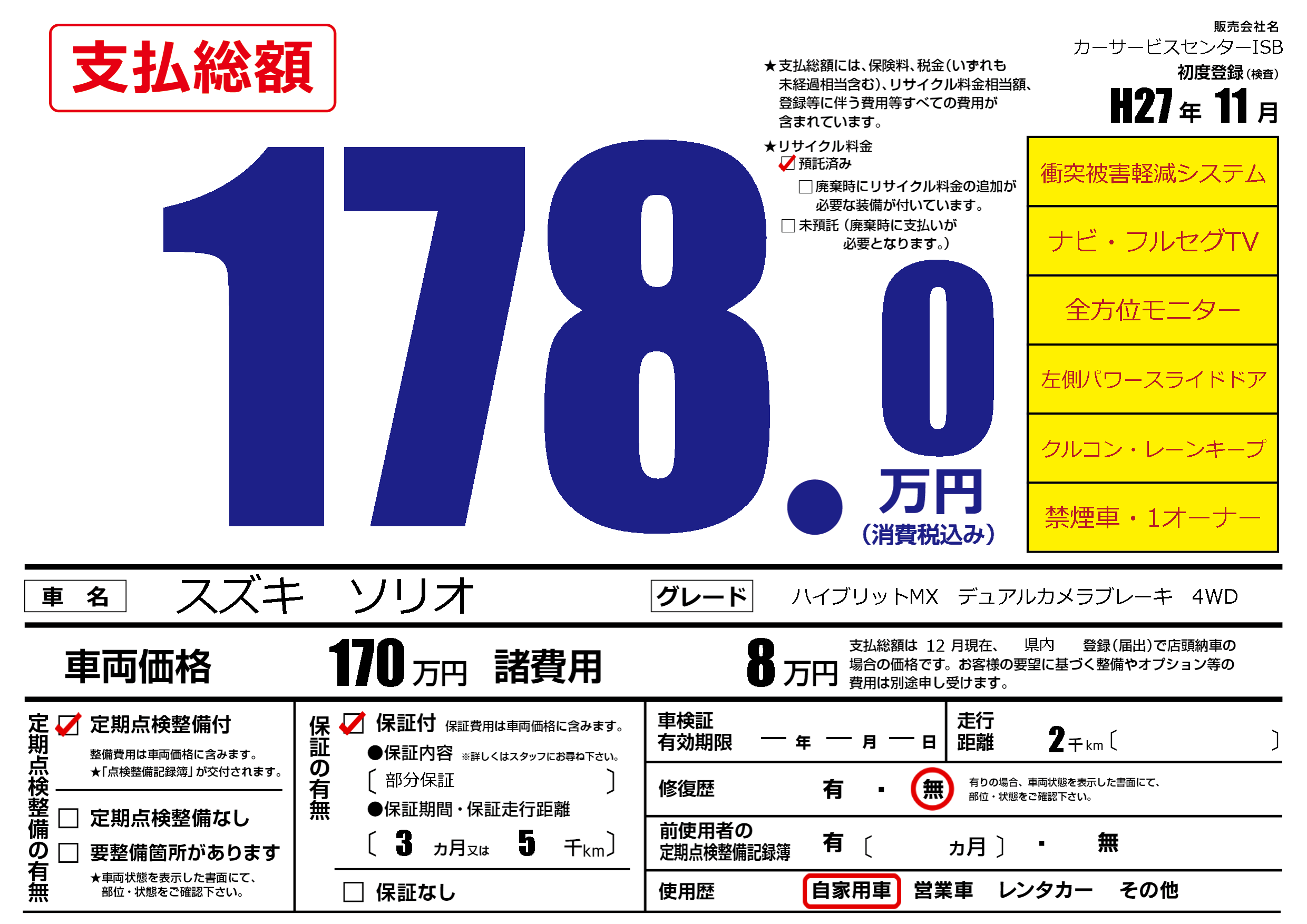 | 車名 | スズキ ソリオ | グレード ミッション 排気量 |