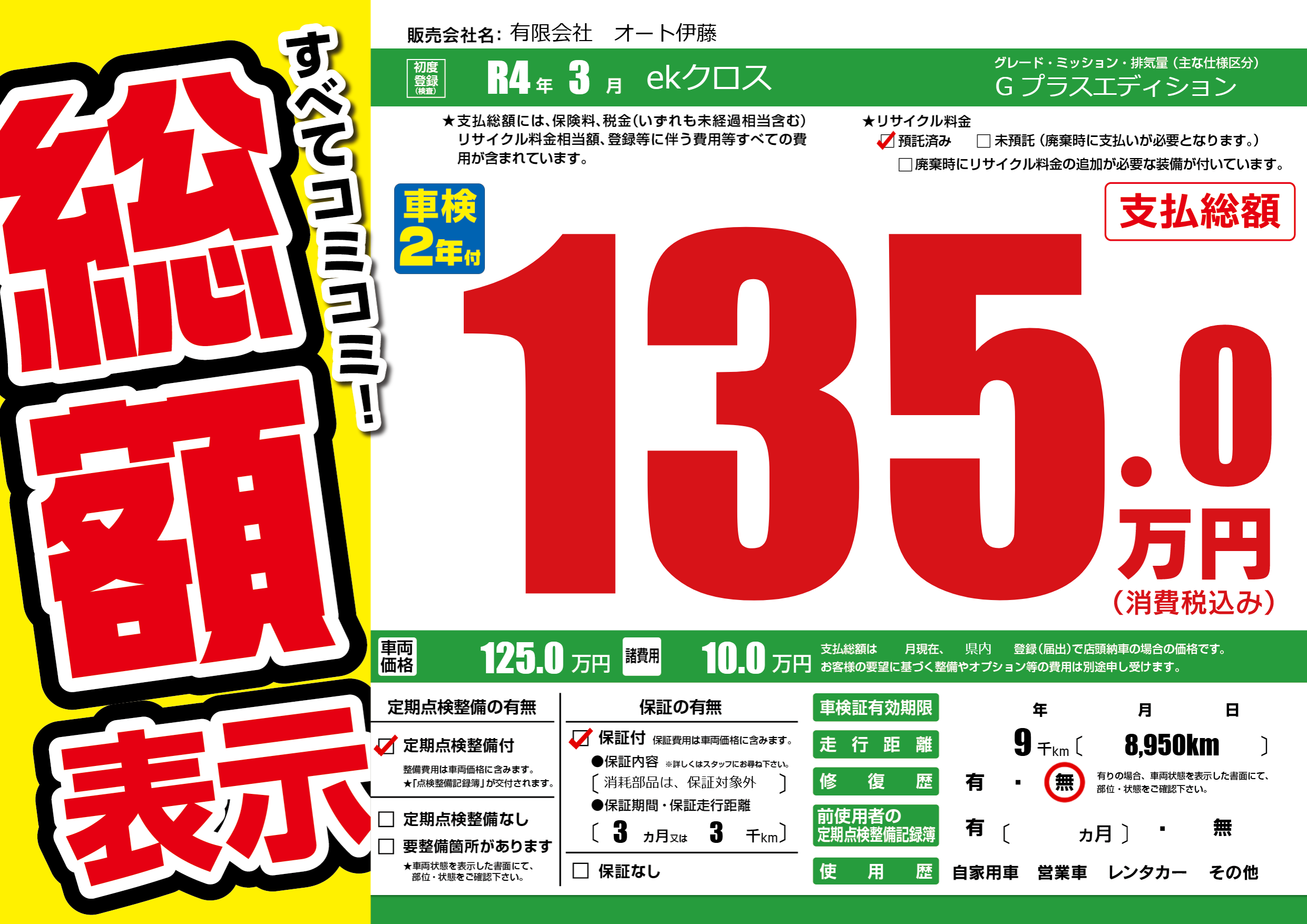 | 走行キロ | 0.9万km | 初年度登録 | R4年3月 |