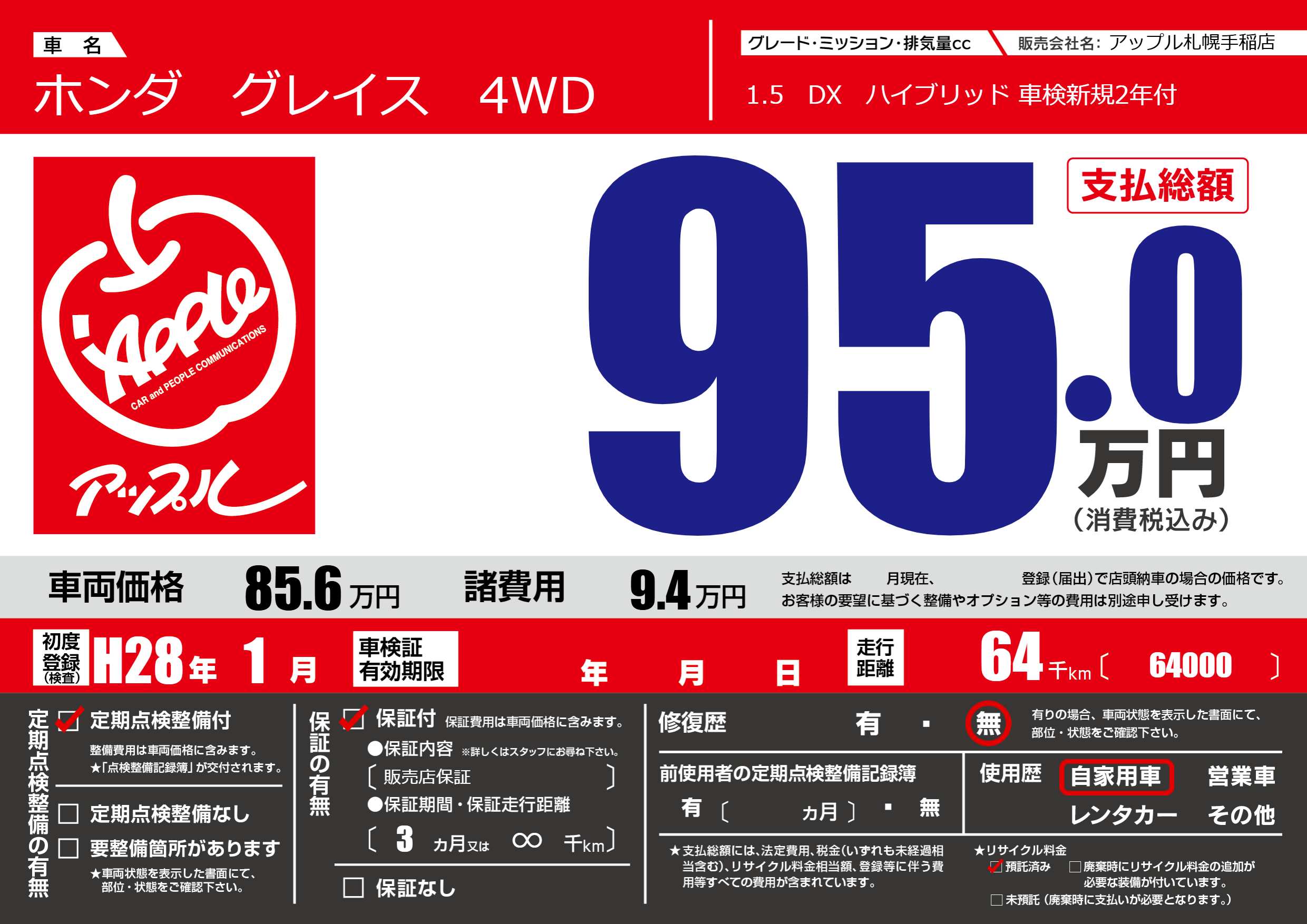| 車名 | ホンダ グレイス 4WD | グレード ミッション 排気量 |