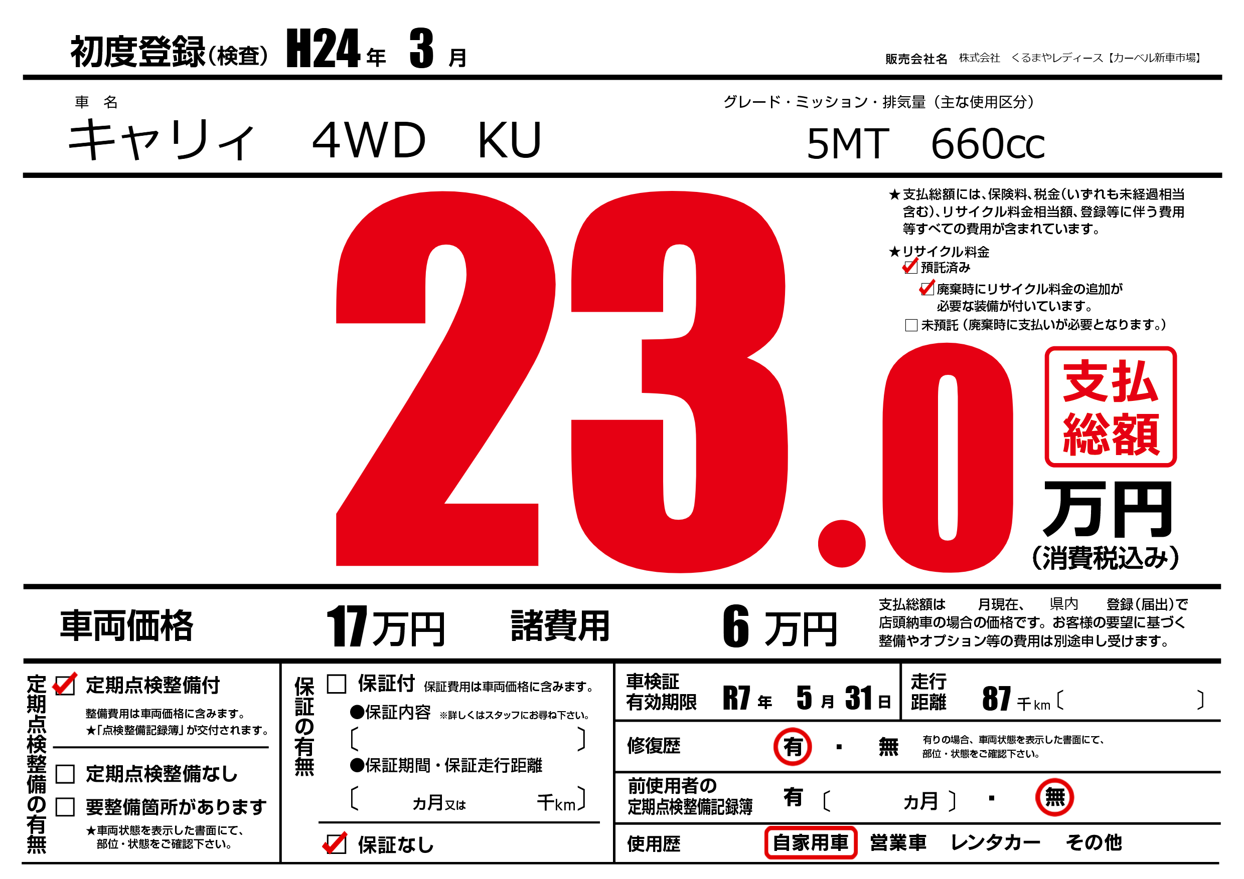 なし | 車検制限 | R7年5月31月 |