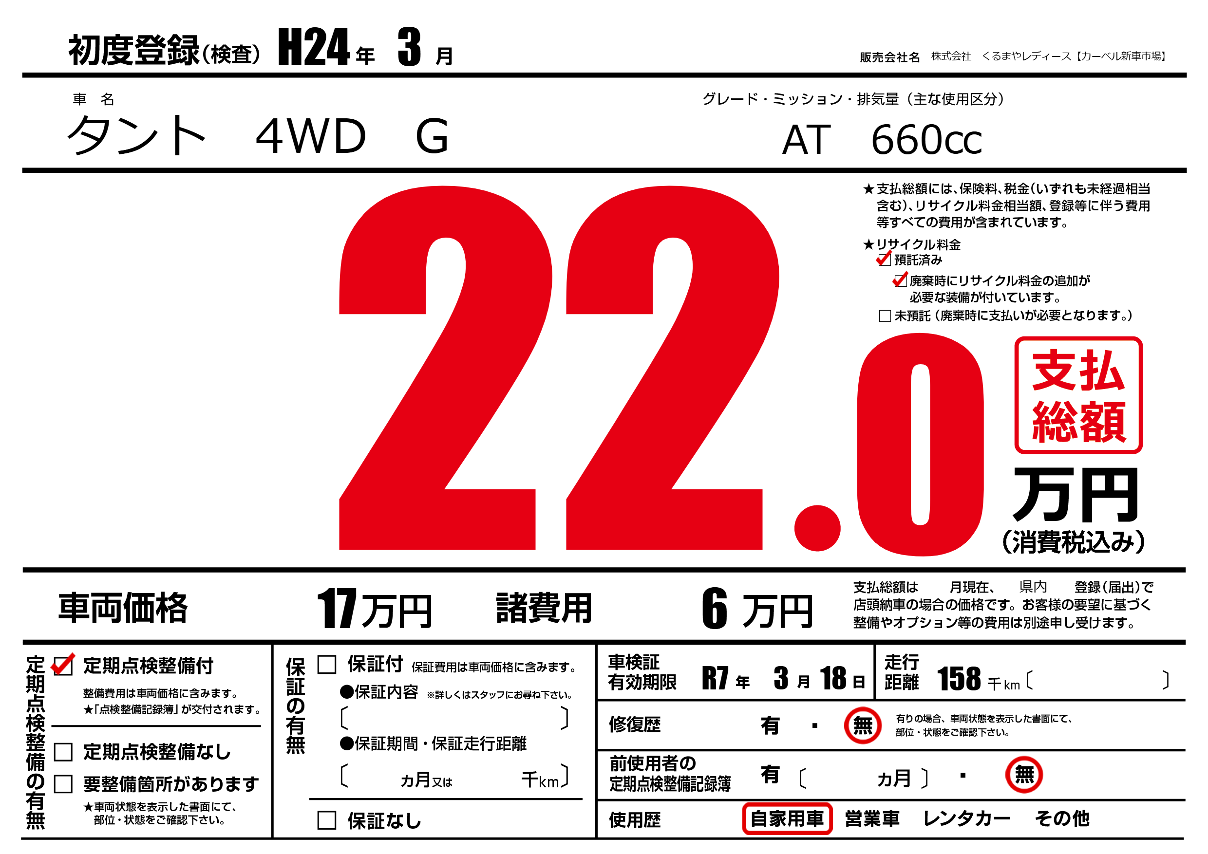 | 車名 | タント 4WD G | グレード ミッション 排気量 |