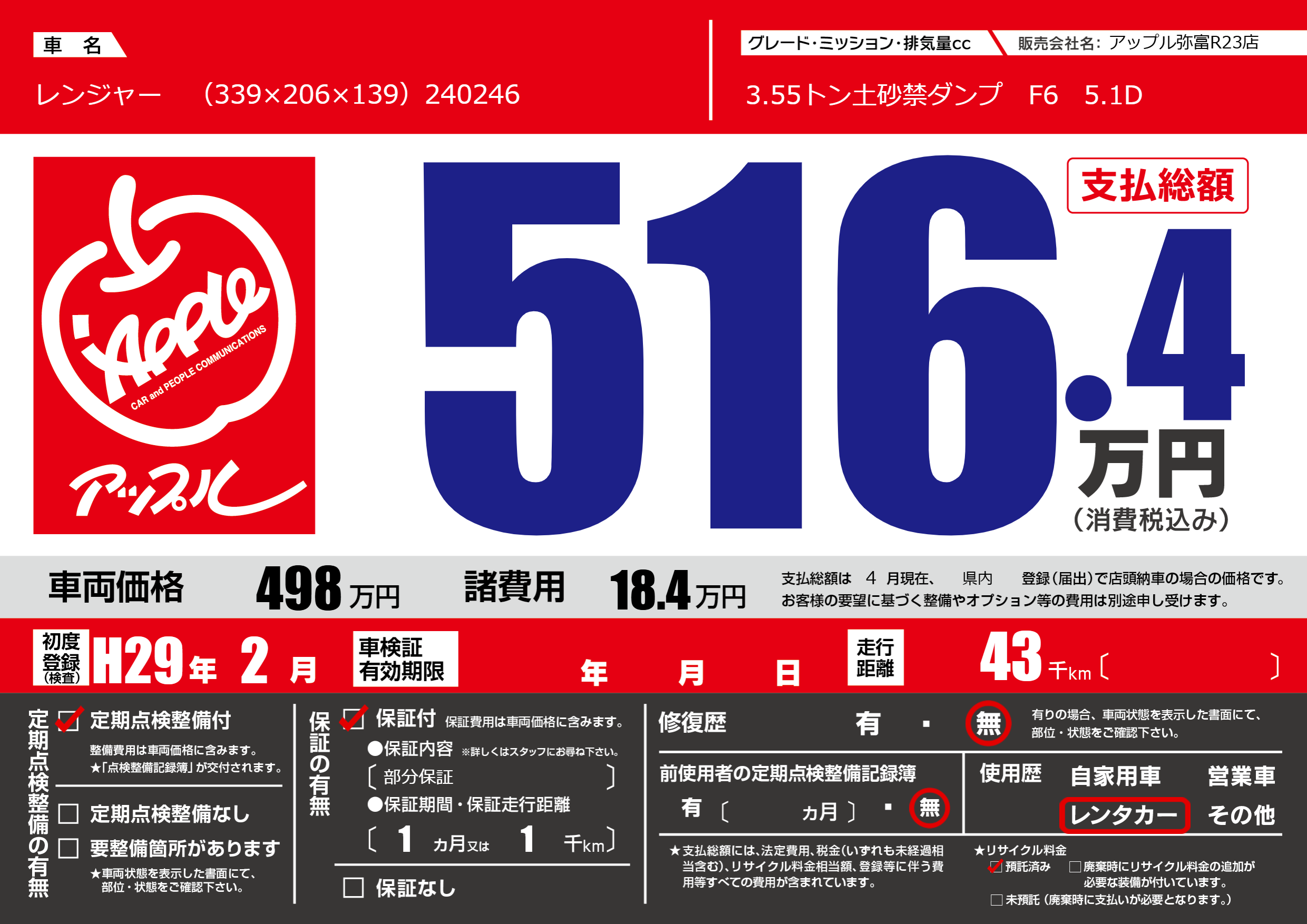 | 走行キロ | 4.3万km | 初年度登録 | H29年2月 |