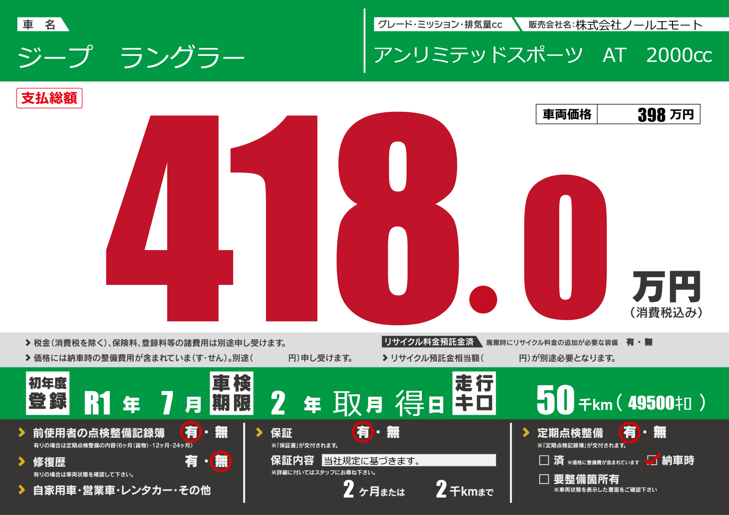 | 車名 | ジープ ラングラー | グレード ミッション 排気量 |
