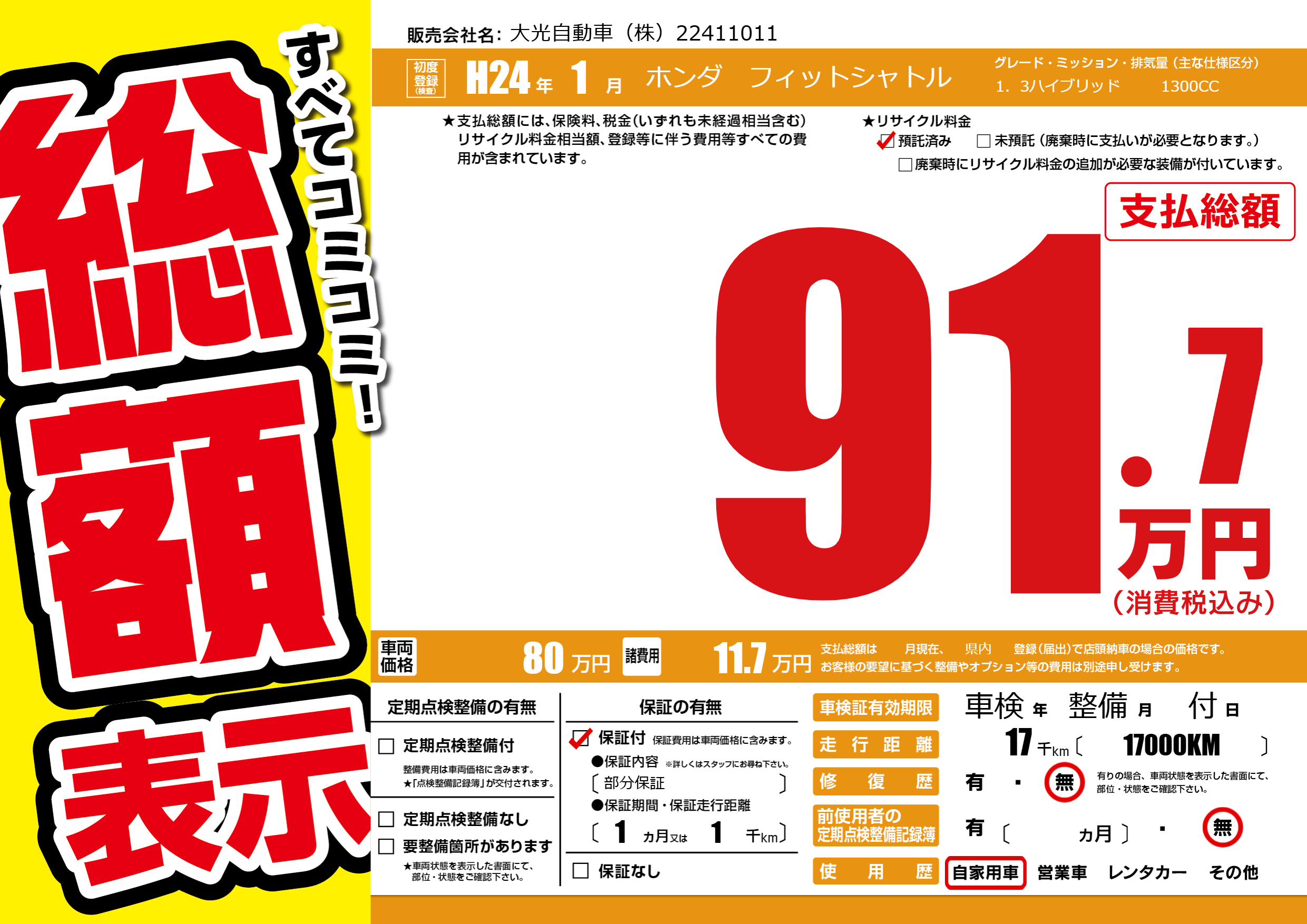 | 走行キロ | 1.7万km | 初年度登録 | H24年1月 |