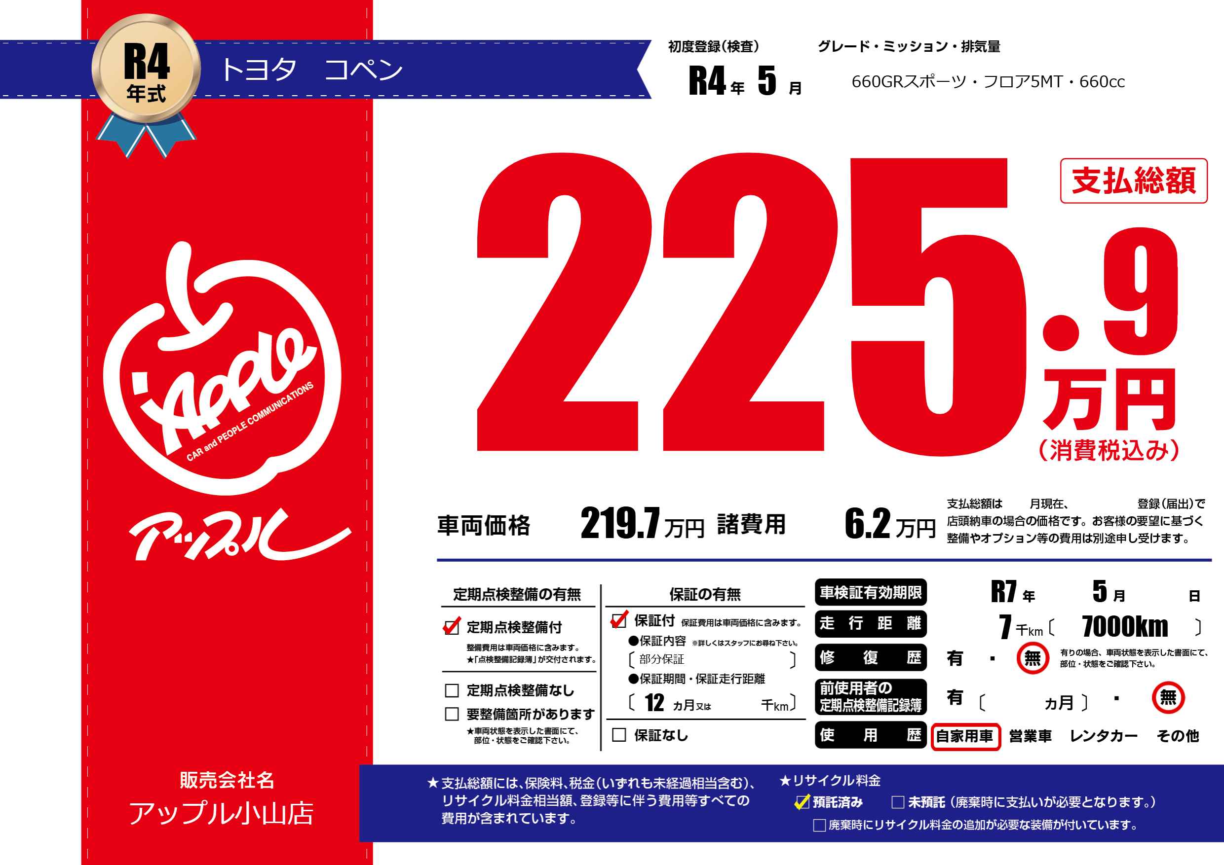 | 車名 | トヨタ コペン | グレード ミッション 排気量 |