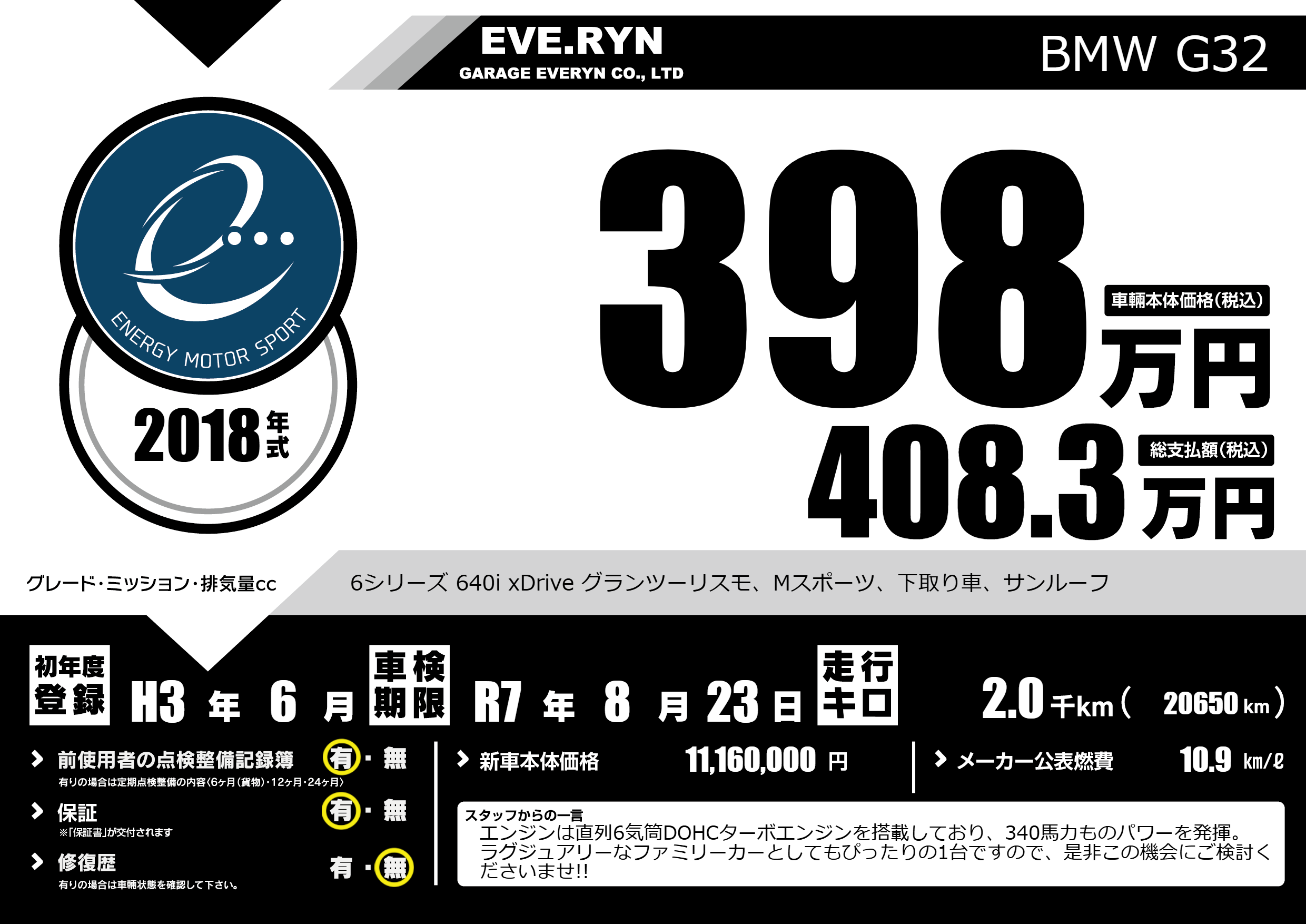 | 車名 | BMW G32 | グレード ミッション 排気量 |
