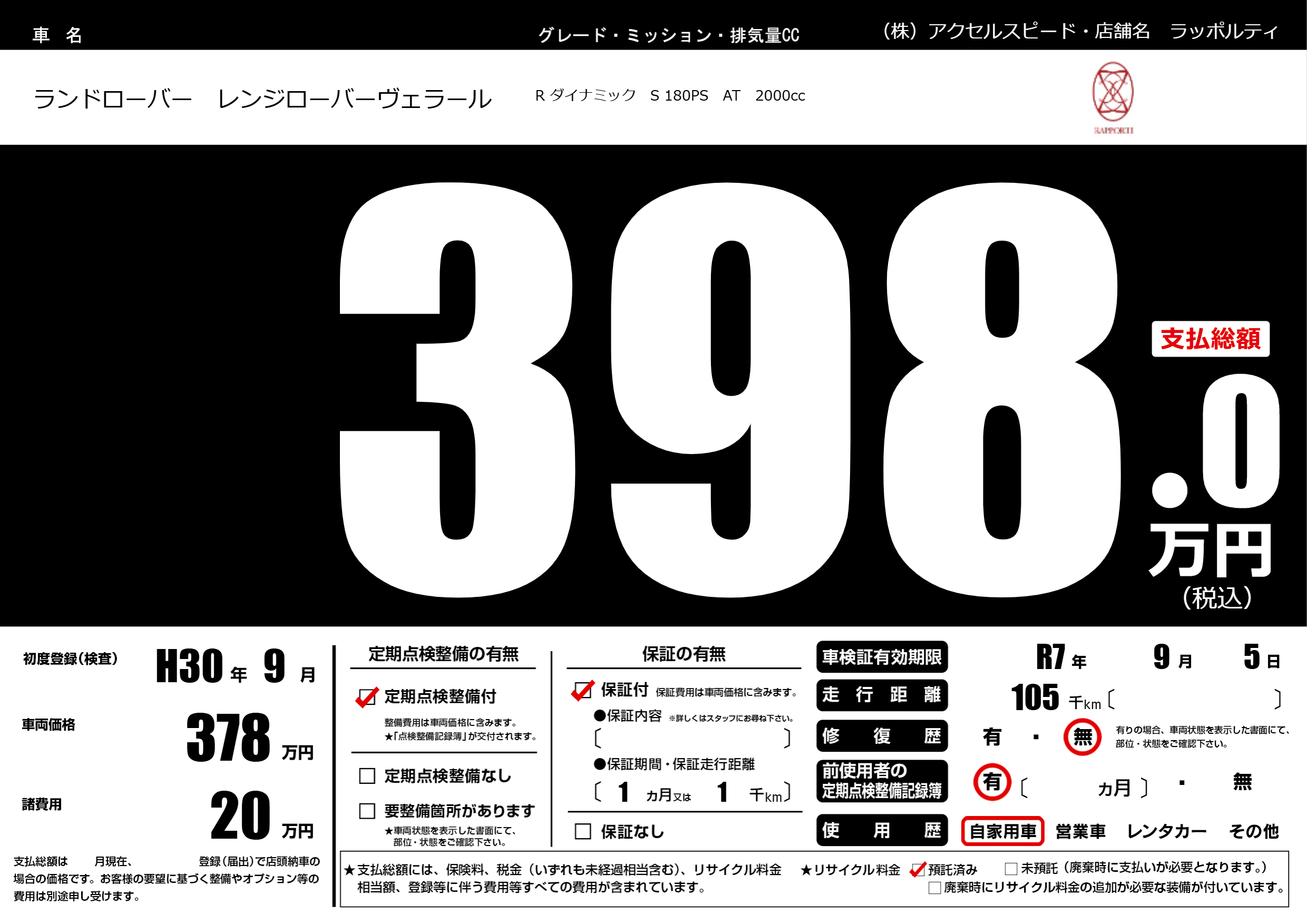 | 車名 | ランドローバー レンジローバーヴェラール | グレード ミッション 排気量 |