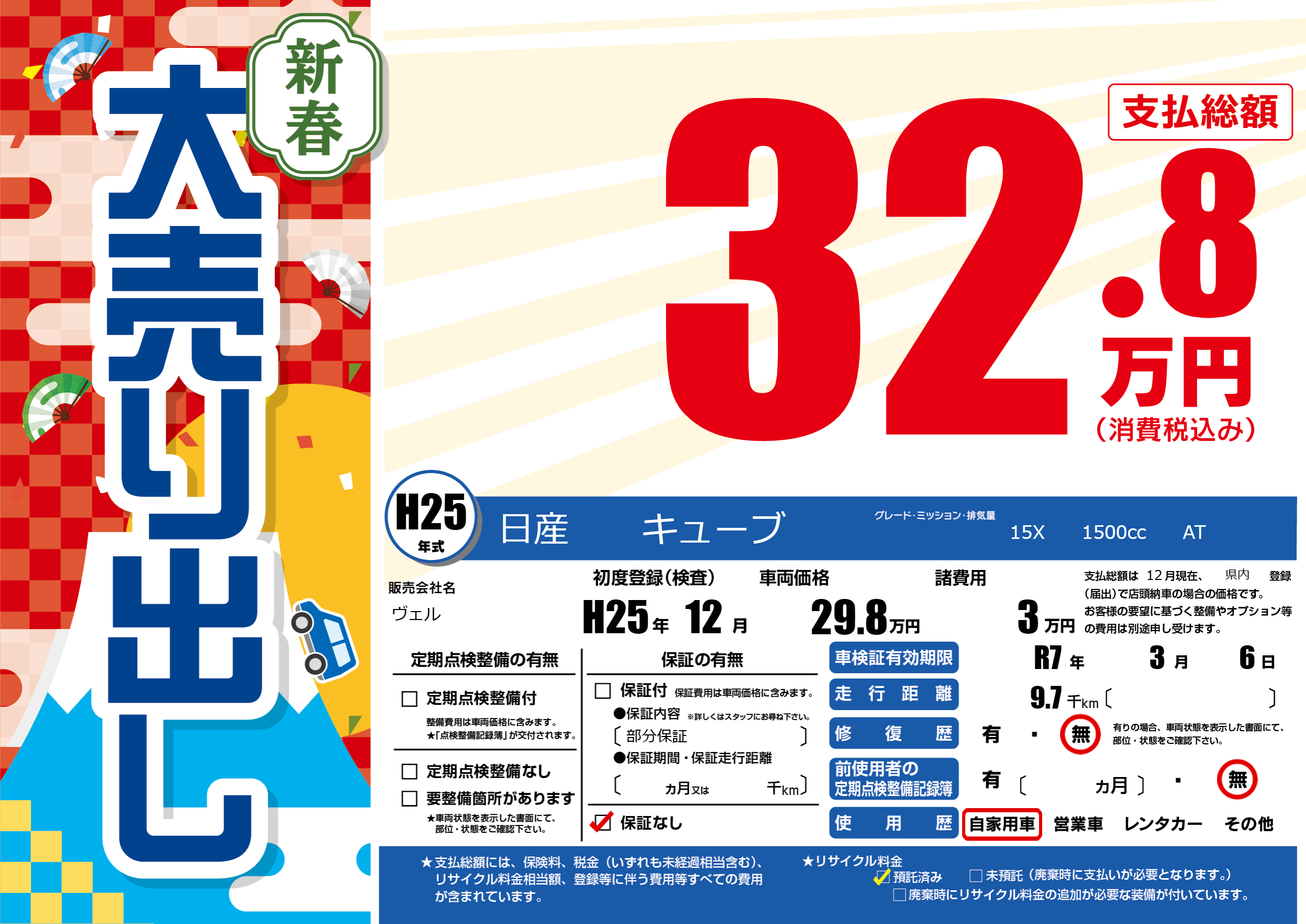 | 車名 | 日産 キューブ | グレード ミッション 排気量 |